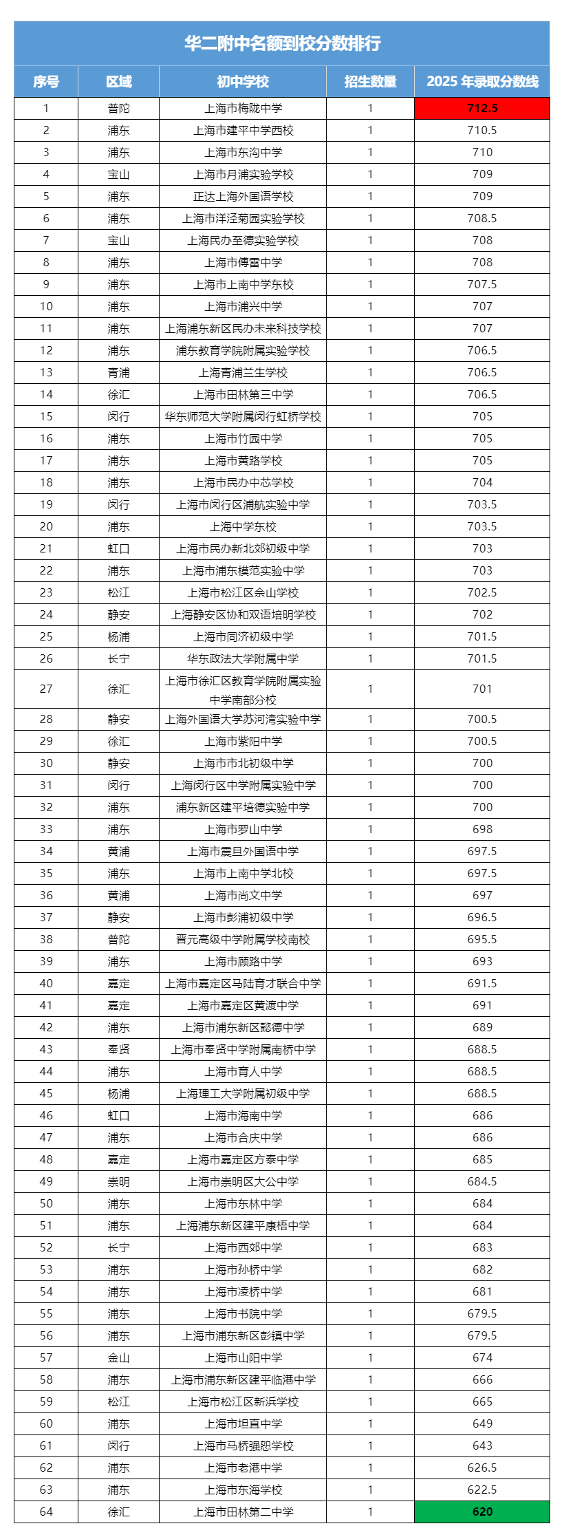 2025年华二名额分配到校计划招生66人,实际录取64人,今日学校和沪港学校名额放空。其中,最低即是徐汇区田林二中的620分,最高为嘉定的梅陇中学,高达712.5分。区域方面,延续传统依旧浦东最多,并且几乎占据半壁江山。