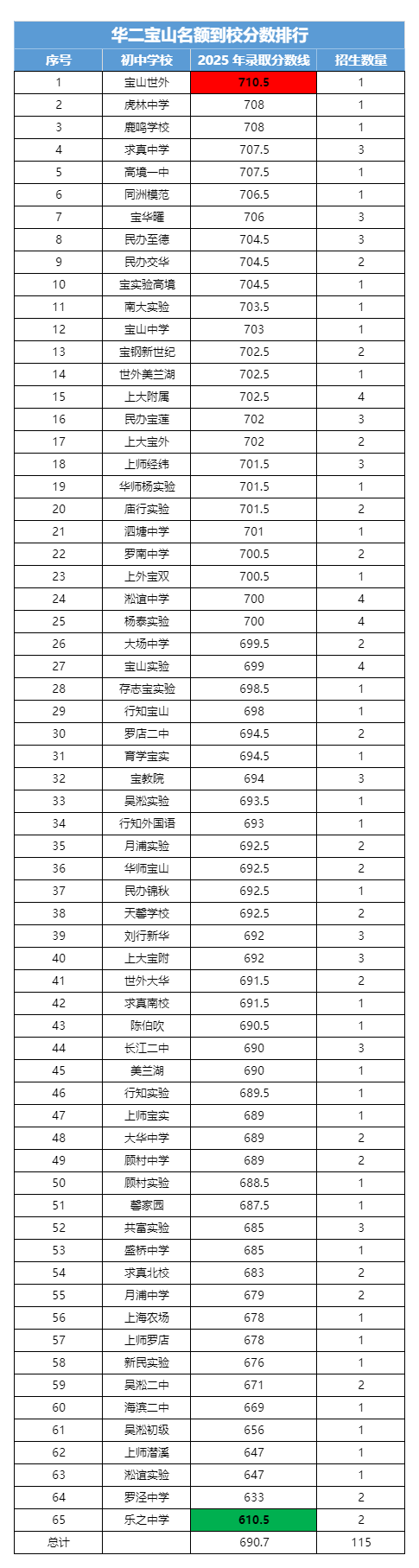 华二宝山名额到校最高分是宝山世外的710.5分,最低为乐之中学的610.5分,差值100分。