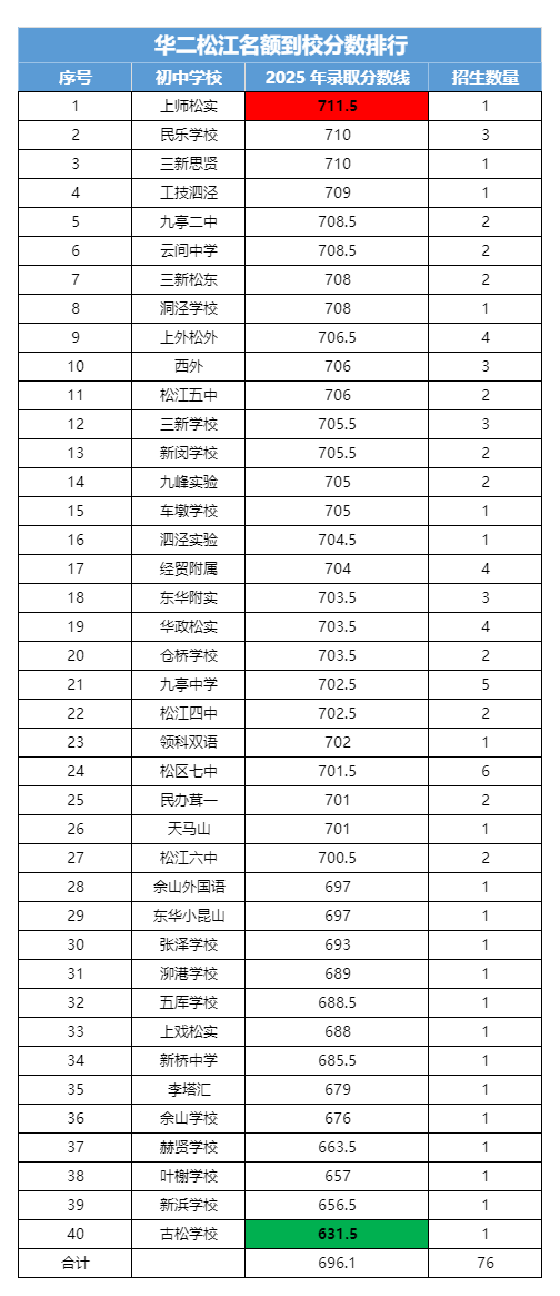 华二松江名额到校最高是松江实验的711.5分,最低是古松学校的631.5分,差值80分。