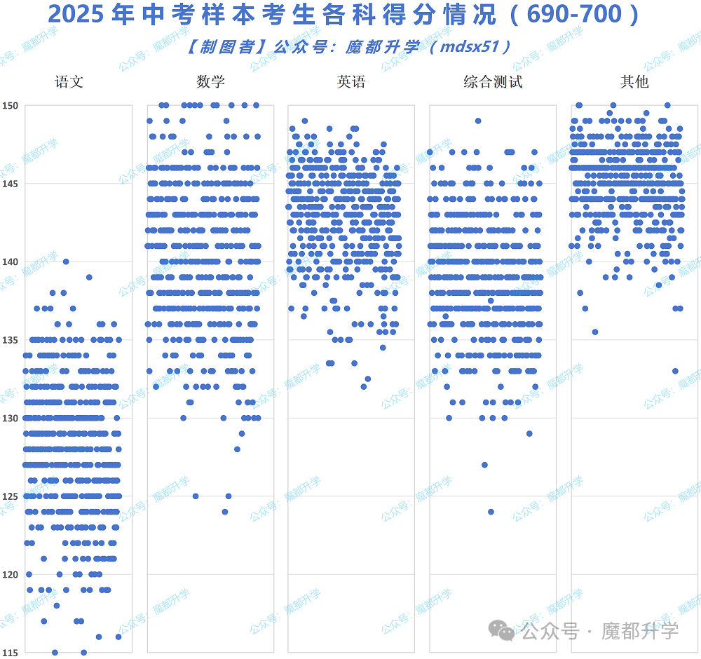 再看中考690 - 700分数段的各科成绩分布:
