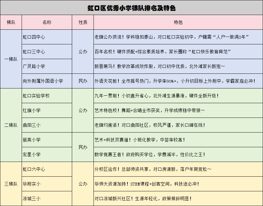 第二梯队还有其他优质学校:长青小学、崇明路小学、中州路小学等20+所 第三梯队还有:四川北路小学、北郊学校等10+所 顶流民办: 上外附小——外语顶流! 宏星——数学王者! 顶流公办: 四中心——学科稳! 虹口实验——直升省心! 第三梯队:保底型公办,稳扎稳打 江湾初级、钟山初级、海南中学、复兴实验、五十二中、丰镇中学… 均以 对口入学为主,升学表现平稳,偶尔闪现“区重黑马”,适合佛系养娃或学区兜底~ 民办初中: 靠“考试/辅导班”提前锁牛娃,集中全区+跨区尖子(如上外附中全市掐尖),四校八大预录占比超90%,竞争白热化! - 公办初中: 多数“对口入学”,生源稳定但层次多元;仅 上外附中是特例,堪称“伪民办级生源”~ 结束语 虹口区的教育资源为家长和孩子提供了丰富多样的选择空间。无论是追求国际化视野的第一梯队学校,还是注重特色发展的第二梯队,甚至是扎根社区的第三梯队,每一所学校都在用自己的方式为学生的成长赋能。希望本文的梯队排名与特色解析,能为您的择校决策提供有价值的参考,帮助孩子找到最适合的教育土壤,开启精彩的求学之旅。