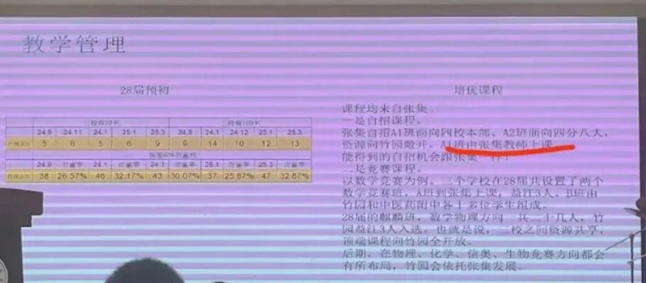 分层教学精准实施:今年的校园开放日讲座中提到,竹园按总分实行分层走班 A1班对标四校,A2班对标四分八大 A1班由张集教师授课