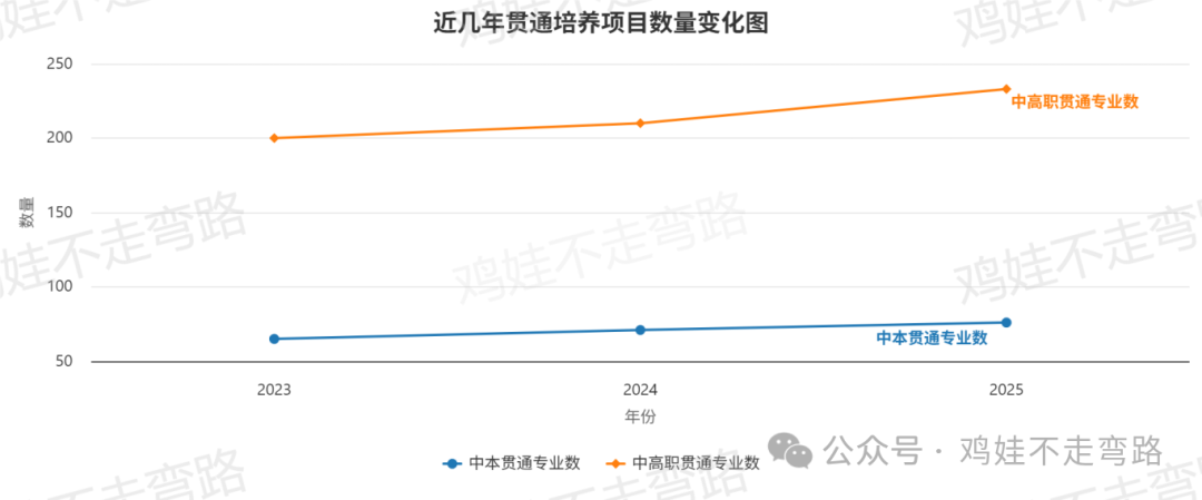 不管是中本贯通专业数,还是中高职贯通专业数,近几年来都是在不断扩大的,而且扩展的方向都是比较新兴的产业。