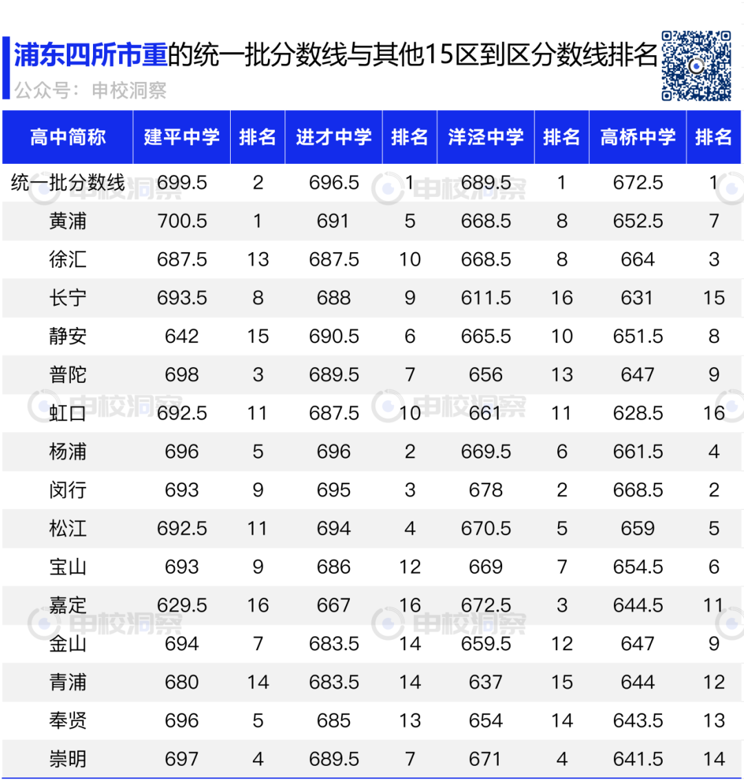 我们为大家做了个有趣的对比,将浦东这四所市重的统一批分数线和其他15区到区分数线进行了排名,也就是如果跨到外区再通过名额到区考回来是否合算的问题?