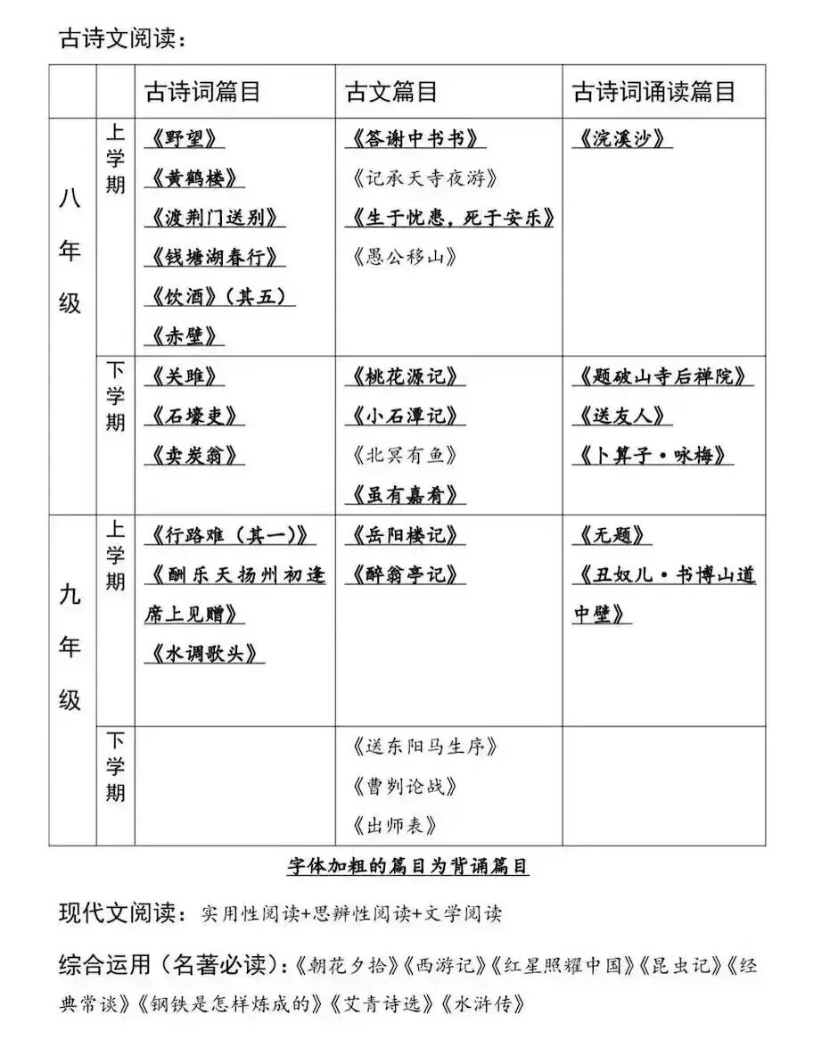 古诗文:七上、七下、八上、九上四册教材