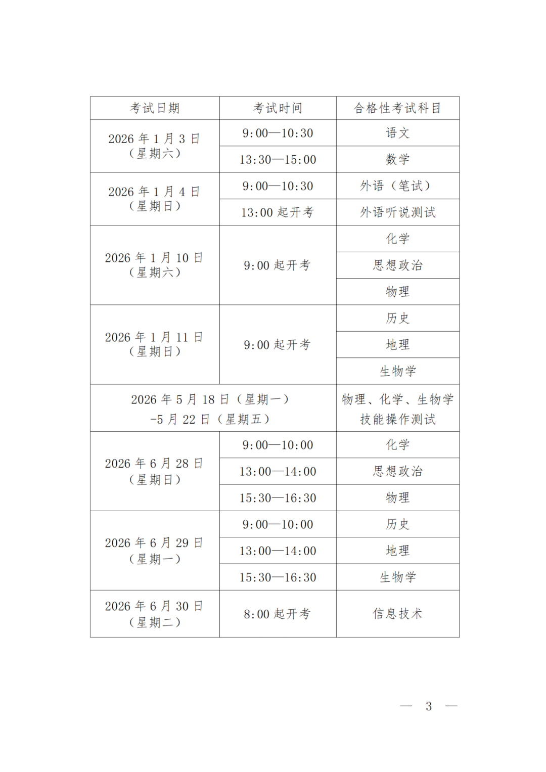 思想政治、历史、地理、物理、化学、生物学分合格性和等级性考试,考试时间均为60分钟。1月合格性考试采用机考方式,多科混排同时开考;6月合格性考试采用闭卷笔试方式。物理、化学和生物学合格性考试另设技能操作测试,测试时间均为15 分钟。