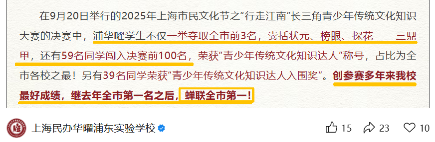 一份稳扎稳打的学术成绩单; 一个名校长领航,华二基因贯通,课程体系完善的教学引擎; 一场场汇聚智慧与远见的“卓越讲堂”; 一种文化自信根植于心的传统涵养; 一股由国防教育磨砺出的挺拔力量 ……