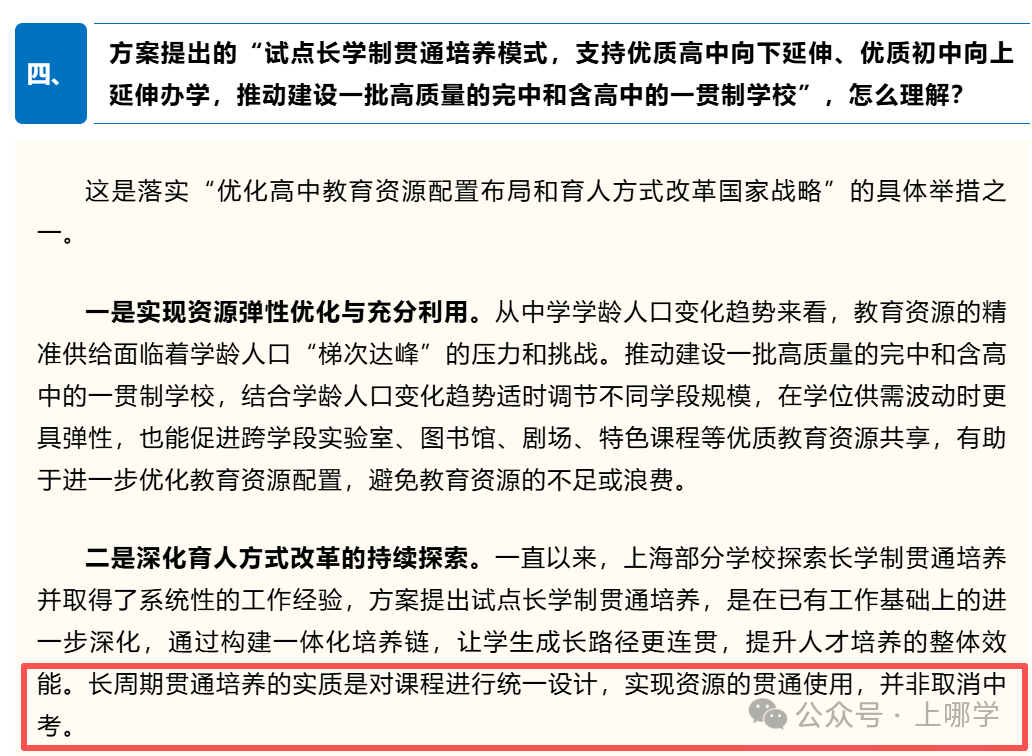 日前,上海市教委发布《上海市普通高中高质量发展实施方案》,其中提到:试点长学制贯通培养模式,支持优质高中向下延伸、优质初中向上延伸办学,推动建设一批高质量的完中和含高中的一贯制学校。