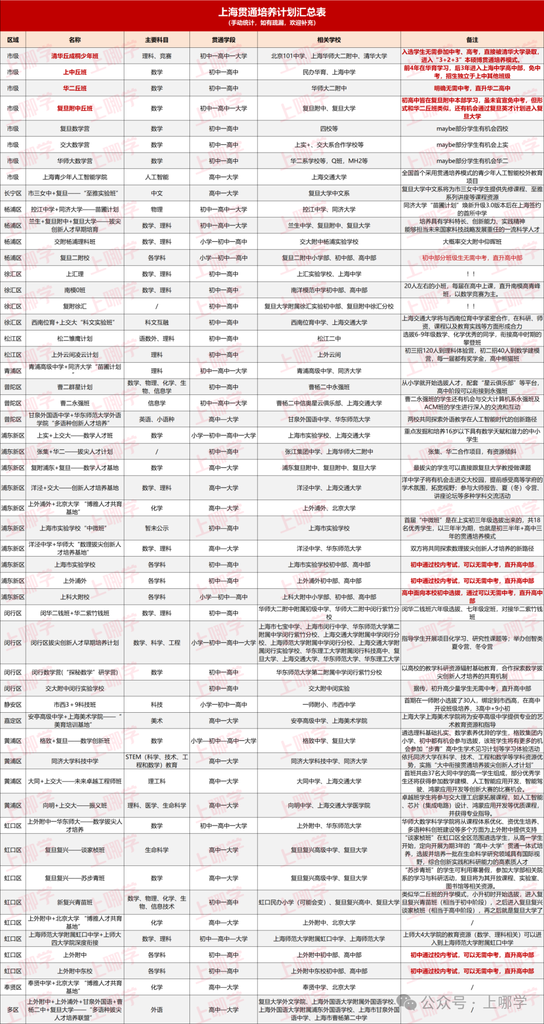 这部分内容,在家长中引起热议,也引起一些猜测,其中包括“上海是否要取消中考”。 对此,官方回答:长周期贯通培养,并非取消中考! 但上海还是有一部分学校是有机会免中考的,比如华二丘班、上外附中、市西3+9等。详情见下表: 总的来说,上海目前的免中考项目数量非常有限,针对的学生也是从小优秀到大的学生,家长们如果发现小孩有相关天赋,可以提早规划小孩的学习,制定目标。 表格上还有很多未明确免中考的贯通培养项目,虽然没有明确能不能直升高中、大学,但通过贯通培养,可能有机会规避掉中考、高考。 对家长和学生来说,未来需要长远打算,在孩子小升初、初升高之前,除了三公、中考外,还可以多留意贯通培养这条路径;在高升大之前,除了综评、强基、竞赛国集、高考外,也还可以多留意贯通培养这条路径。