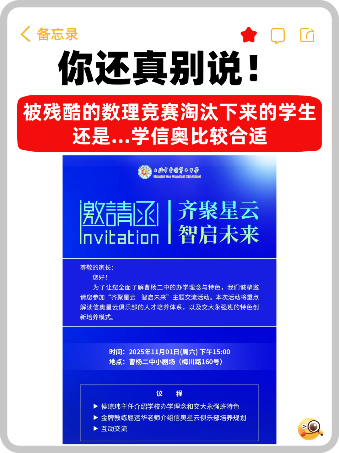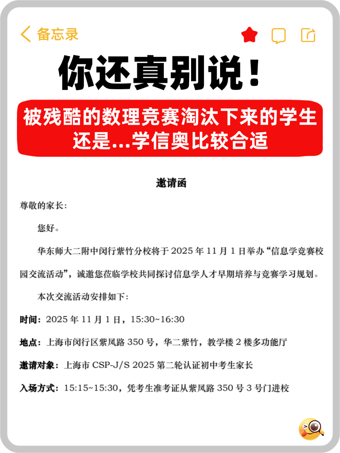 ②选拔标准“隐性提高”:学校会在现有的笔试、面试基础上,更看重娃的学科竞赛背景、综合素养、学术潜力。