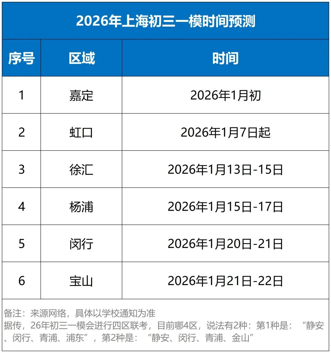 目前部分区,初三一模时间已经出炉,且有消息称,本届初三一模会进行四区联考,这样的话更能体现成绩的价值!