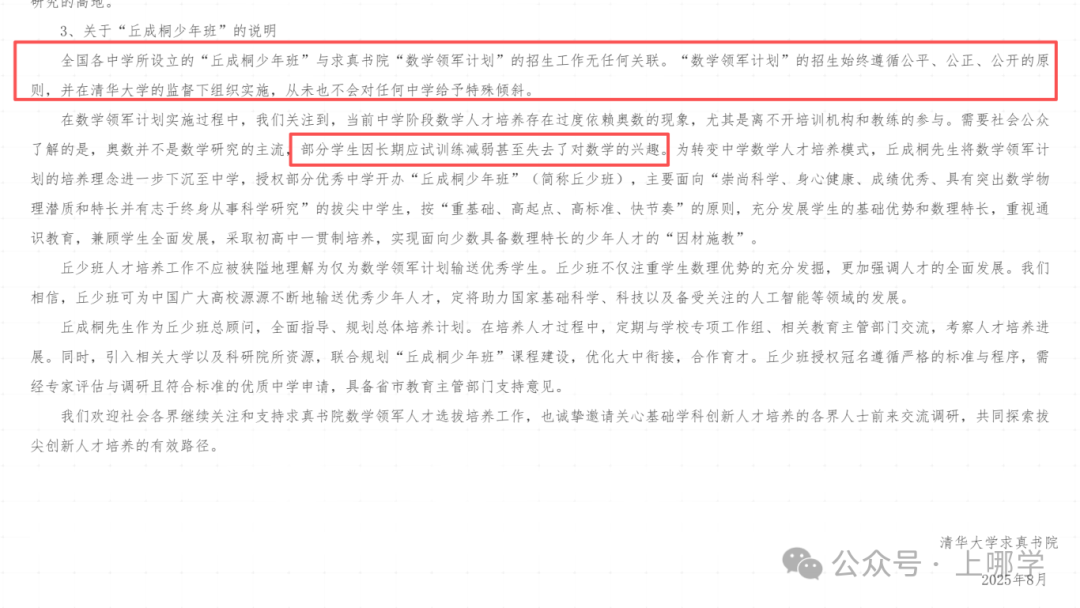 这段声明,打破了“丘班”直升清华的说法,也打破了家长对“丘班”的预期。