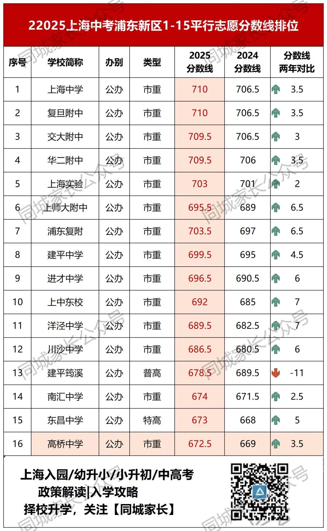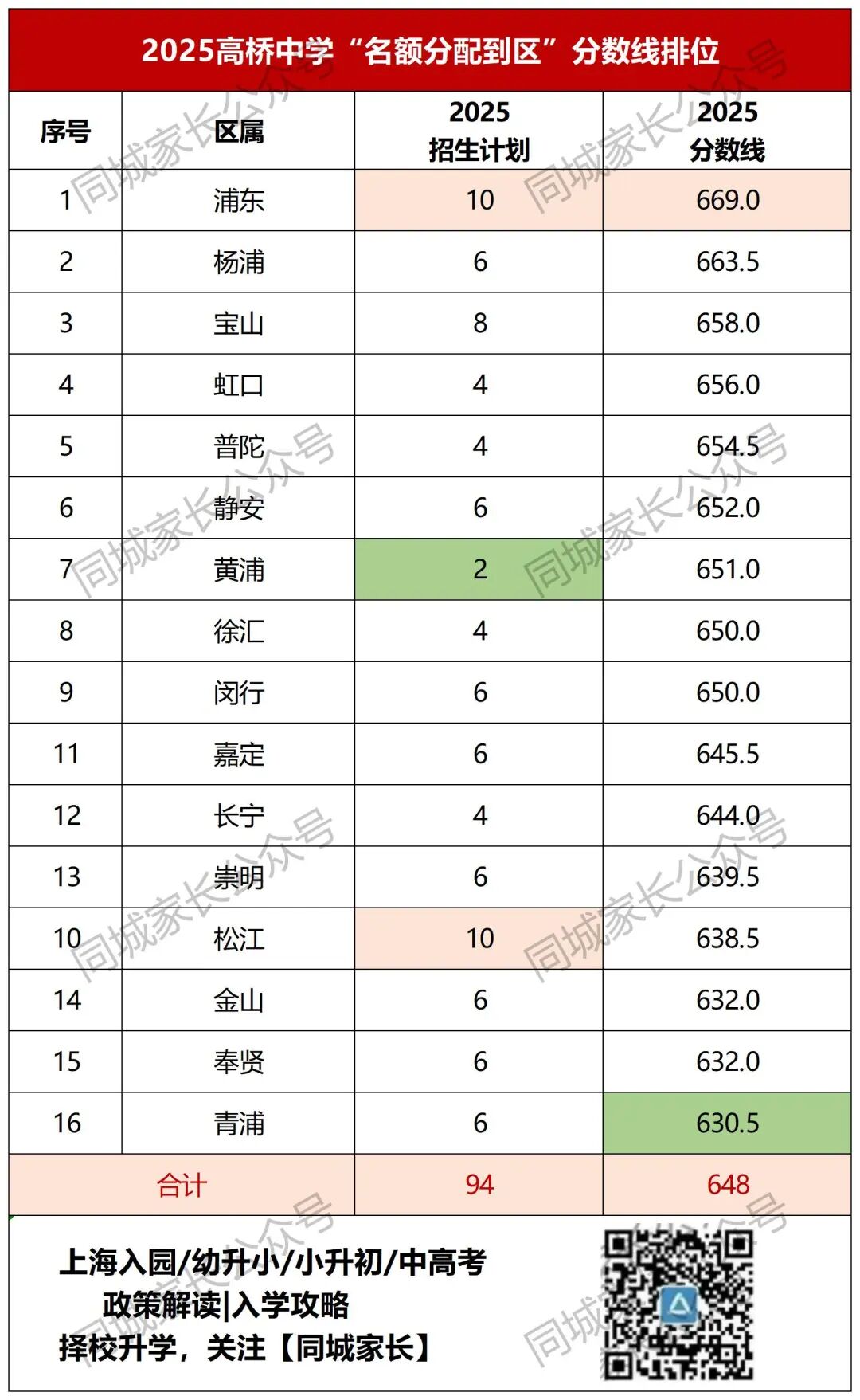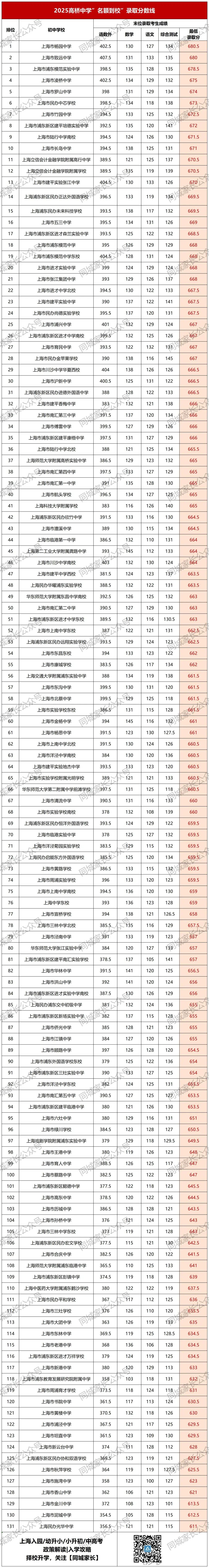 上海市高桥中学坐落于浦东新区的千年古镇高桥镇季景北路859号,创始于1911年,是一所具有百年历史的名校,时列上海市十八所市立中学之一。 这所跨越两个世纪的百年老校,坚守“为学以理,积学精业”的校训,以教师发展夯实育人基石,以课程建设描绘育人蓝图,以成就学生为核心目标,培养文质彬彬、和而不同、兼济天下的“现代君子”。2024年春,上海市高桥中学入列上海市实验性示范性高中。 为支持百年名校高桥中学跨越式发展,森兰校区应运而生。 本项目总投资为79211.09万元,用地面积30200.9平方米,建成后总建筑面积61980平方米。项目位于金桥-外高桥单元规划G03B街坊G03B-08地块,东至高杰路,南至东煦路,西至莱阳路,北至思学路。项目已正式进入工程建设期,将打造一座现代化高品质的智慧校园,建成后学校办学规模将扩容至少1倍,为学生全面而有个性的发展提供良好的环境,为学校高质量发展提供保障。 上海市高桥中学党总支书记、校长沈正东表示,高桥中学森兰校区的新建是学校发展史上的又一个里程碑。学校将传承百年办学积淀,秉持“为党育人,为国育才”的初心使命,努力将森兰校区打造成为现代化、智慧化、人文化的高品质校园。 接下来,我们再为大家介绍下24年荣升市重的高桥中学,在中考各批次录取的一些情况… 上海市高桥中学建于1911年,地处中国历史文化名镇高桥镇核心区域,毗邻中国(上海)自由贸易试验区。作为一所园林式学校,高桥中学从创立至今一直坐落在人文底蕴深厚、自然环境优美的“高桥公园”旧址。园林式的教学范围,滋养了一代代的高桥英才。 2024年的春天,这所百年老校再绽芳华:入列上海市实验性示范性高中。“实至名归、水到渠成!”原市教委教研室副主任、特级教师赵才欣给出了这样的评价:“办学文化之厚实积淀、课程教学之深耕达精,以及育人成果之名声高稳,都让高桥中学无愧历史名校品质和区域高质量发展担当。” 据悉,位于浦东外高桥森兰板块的高桥中学新校区今年将开工建设。建成后学校办学规模将扩容至少1倍。这所有着深厚积淀的百年老校、也是最年轻的市实验性示范性高中,将迎来新的发展机遇,在跨越式发展的快车道上持续向前。 1.平行志愿 2025年,高桥中学平行志愿共计招生计划114人。中考平行志愿分数线672.5分,同比去年上涨3.5分。 2025年,高桥中学在名额分配到区共计招生计划94人,其中,本区10个名额,其次松江也获得10个名额,黄浦各获得最少的2个名额。 2025年高桥中学到区投档分数线最低分数线:青浦区(630.5分,不含综评50分),最高分数线:浦东新区(669分,不含综评50分)。