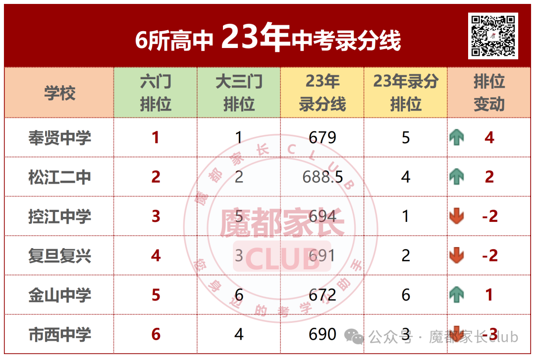 1、奉贤中学用实力上演了一场惊艳的逆袭大戏!2023 年中考平行志愿录取中,分数线仅有679分,排位第5,在6校中生源起点并不占优。