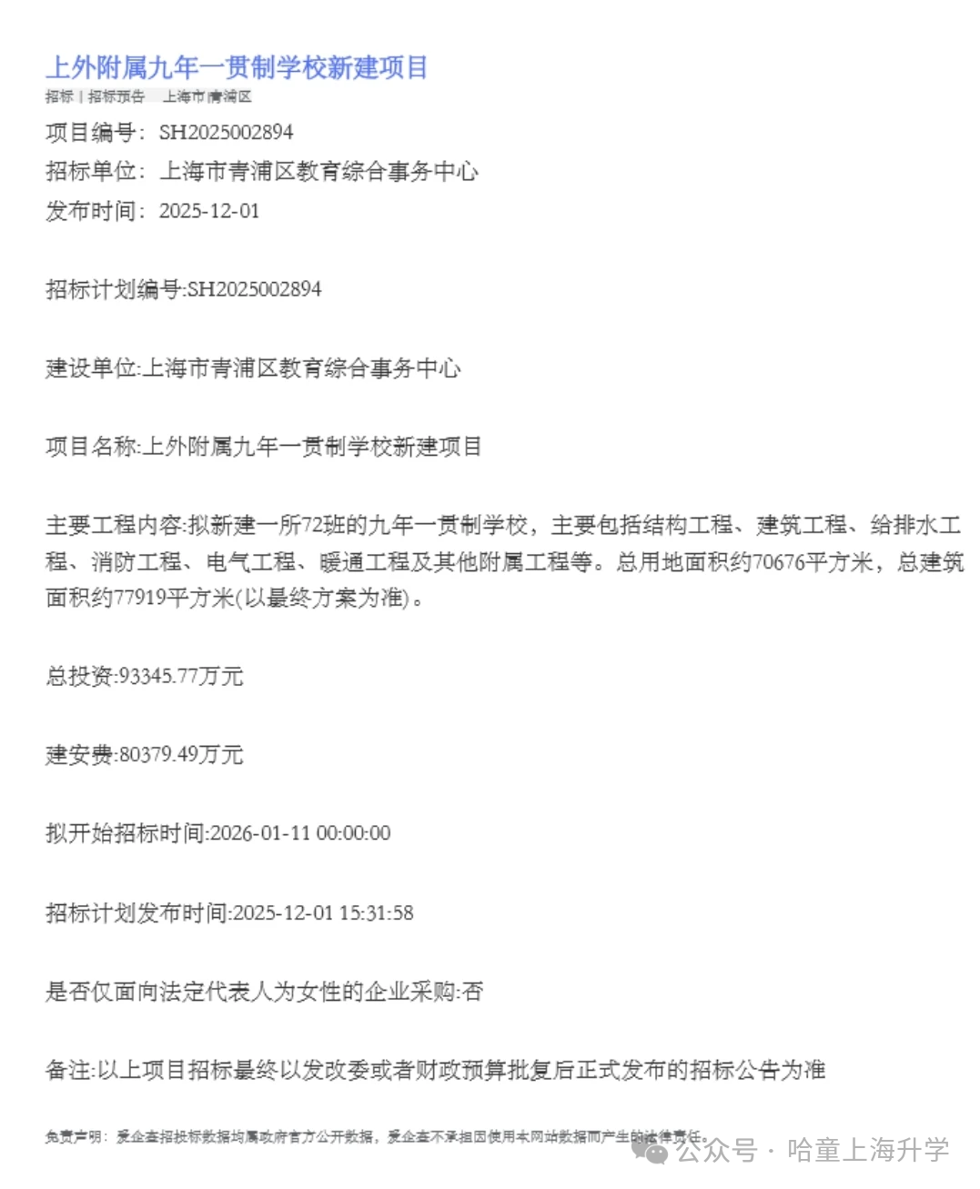 招标公告透露了更多上外九年一贯制学校的消息,一起来看看: