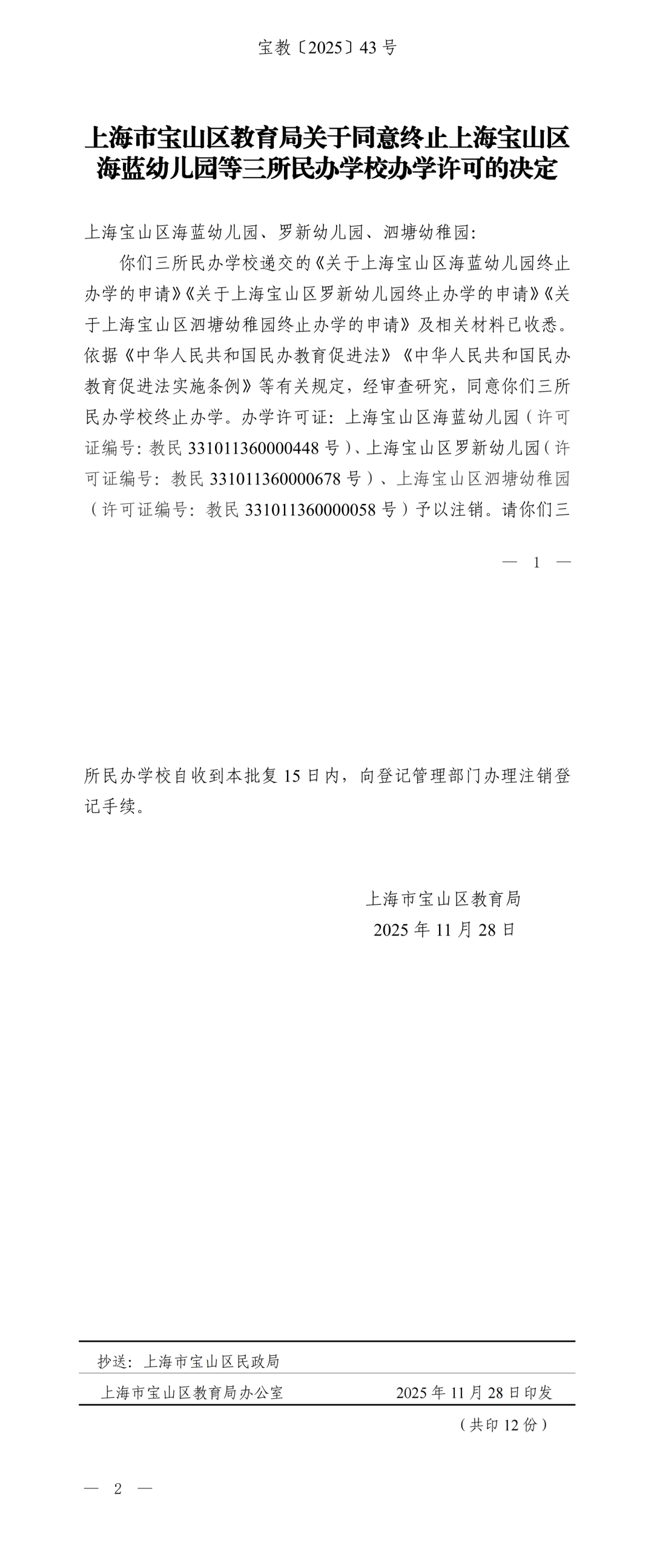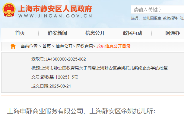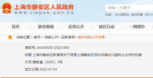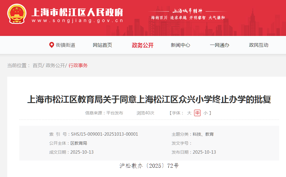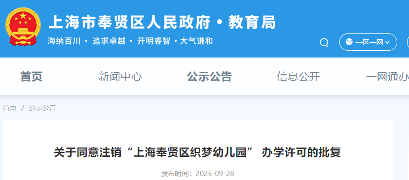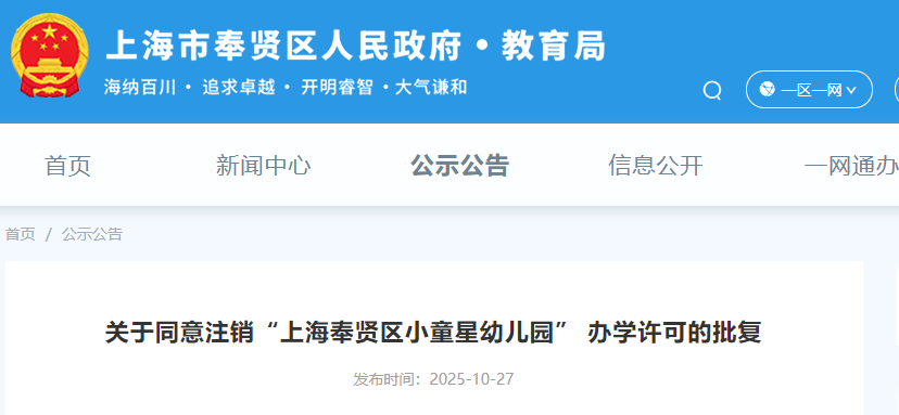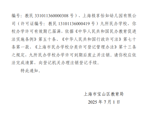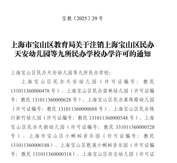 上海宝山区海蓝幼儿园、罗新幼儿园、泗塘幼稚园: 你们三所民办学校递交的《关于上海宝山区海蓝幼儿园终止办学的申请》《关于上海宝山区罗新幼儿园终止办学的申请》《关于上海宝山区泗塘幼稚园终止办学的申请》及相关材料已收悉,依据《中华人民共和国民办教育促进法》《中华人民共和国民办教育促进法实施条例》等有关规定,经审查研究,同意你们三所民办学校终止办学。 办学许可证:上海宝山区海蓝幼儿园(许可证编号:教民 331011360000448号)、上海宝山区罗新幼儿园(许可证编号:教民 331011360000678号)、上海宝山区泗塘幼稚园(许可证编号:教民 331011360000058号)予以注销。 新学期已过半,2025年余额也仅剩不到2个月,小编翻阅教育局官网发现,近日又有30所学校官宣终止办学; 另外今年以来,上海已经有78所学校关停;有关停就有新建,今年上海共51所新建校。 具体是哪些学校呢?我们一起来看…… 1.小童星幼儿园 关于同意注销“上海奉贤区小童星幼儿园” 办学许可的批复 上海奉贤区小童星幼儿园: 你公司提出的关于注销“上海奉贤区小童星幼儿园”的申请及相关材料已收悉,根据《中华人民共和国民办教育促进法》《中华人民共和国行政许可法》的有关规定,经审核,同意注销“上海奉贤区小童星幼儿园”办学许可登记,依法办理终止手续。 特此批复。 上海市奉贤区教育局 2025年10月27日 2.织梦幼儿园 关于同意注销“上海奉贤区织梦幼儿园” 办学许可的批复 上海奉贤区织梦幼儿园: 你公司提出的关于注销“上海奉贤区织梦幼儿园”的申请及相关材料已收悉,根据《中华人民共和国民办教育促进法》《中华人民共和国行政许可法》的有关规定,经审核,同意注销“上海奉贤区织梦幼儿园”办学许可登记,依法办理终止手续。 特此批复。 上海市奉贤区教育局 2025年9月28日 1.星之梦幼儿园 上海市宝山区教育局关于同意终止上海宝山区星之梦幼儿园办学许可的决定 上海宝山区星之梦幼儿园: 你园递交的《关于上海宝山区星之梦幼儿园终止办学的申请》及相关材料已收悉。依据《中华人民共和国民办教育促进法》等有关规定,经审核研究,同意你园终止办学。办学许可证(编号:教民331011360000638号)予以注销。请你园依法向登记管理部门办理注销登记手续。 上海市宝山区教育局 2025年8月21日 2.民办天安幼儿园等9所民办学校 上海市宝山区教育局关于注销上海宝山区民办天安幼儿园等9所民办学校办学许可的通知 1.众兴小学 上海市松江区教育局关于同意上海松江区众兴小学终止办学的批复 上海松江区众兴小学: 你学校提出的关于终止办学的申请报告已收悉。经研究,同意你们终止办学的申请。 请你们根据《中华人民共和国民办教育促进法》有关规定,依法办理相关的注销登记手续。 市光托儿所等6家托儿所 关于同意注销上海杨浦区市光托儿所等6家托儿所办学许可证的批复 上海杨浦区市光托儿所、上海杨浦区双辽托儿所、上海杨浦区隆昌托儿所、上海杨浦区中原托儿所、上海杨浦区国定托儿所和上海杨浦区平凉托儿所,你们申请注销办学许可证的相关材料已收悉,根据《中华人民共和国民办教育促进法》的第五十六条第一款规定,同意你园注销办学许可的申请,请自收到本文15日内持本批文到上海市杨浦区民政局办理相关注销登记,完成相关手续1个月内通过书面形式向我局报告。 此复 杨浦区教育局 2025年10月10日 1.余姚托儿所 上海市静安区教育局关于同意上海静安区余姚托儿所终止办学的批复 上海申静商业服务有限公司、上海静安区余姚托儿所: 你单位递交的关于上海静安区余姚托儿所终止办学的申请材料已收悉。根据《中华人民共和国民办教育促进法》第八章的有关规定,经审查,同意上海静安区余姚托儿所终止办学,同时注销办学许可证(办学许可证号:教民131010660530088号)。 接此批复后,你校应尽快妥善完成剩余资产处置,并向相关部门办理注销登记手续。 特此批复。 上海市静安区教育局 2025年8月21日 2.张家宅托儿所 上海市静安区教育局关于同意上海静安区张家宅托儿所终止办学的批复 上海申静商业服务有限公司、上海静安区张家宅托儿所: 你单位递交的关于上海静安区张家宅托儿所终止办学的申请材料已收悉。根据《中华人民共和国民办教育促进法》第八章的有关规定,经审查,同意上海静安区张家宅托儿所终止办学,同时注销办学许可证(办学许可证号:教民131010660530038号)。 接此批复后,你校应尽快妥善完成剩余资产处置,并向相关部门办理注销登记手续。 特此批复。 上海市静安区教育局 2025年7月31日 3.民办双美幼儿园 上海市静安区教育局关于同意上海静安区民办双美幼儿园终止办学的批复 上海双美软件开发有限公司、上海静安区民办双美幼儿园: 你单位递交的关于上海静安区民办双美幼儿园终止办学的申请材料已收悉。根据《中华人民共和国民办教育促进法》第八章的有关规定,经审查,同意上海静安区民办双美幼儿园终止办学,同时注销办学许可证(办学许可证号:教民131010860000258号)。 接此批复后,你校应尽快妥善完成剩余资产处置,并向相关部门办理注销登记手续。 特此批复。 上海市静安区教育局 2025年7月4日 1.民办佳禾幼儿园 关于准予上海浦东新区民办佳禾幼儿园终止办学的批复 上海浦东新区民办佳禾幼儿