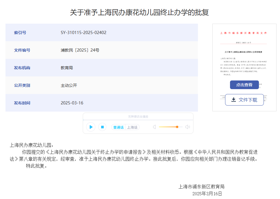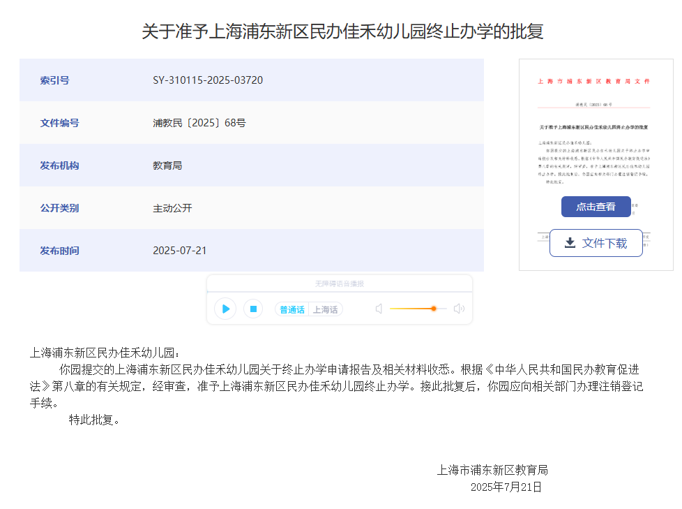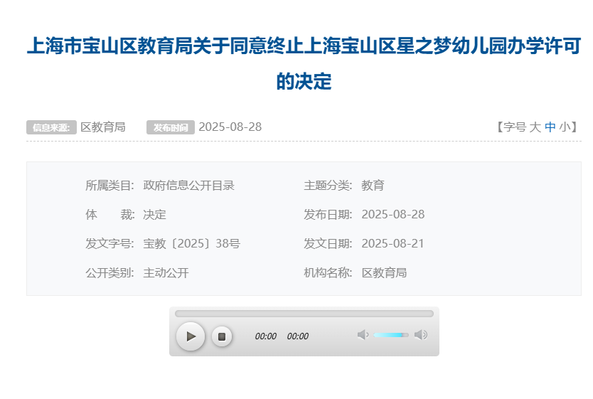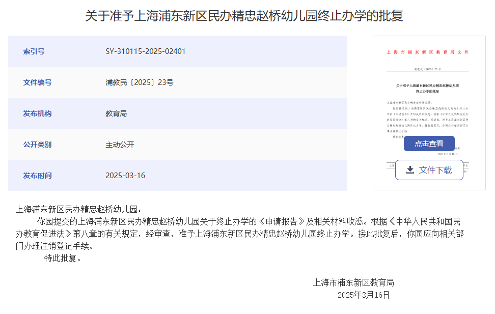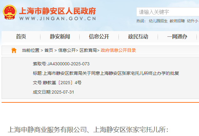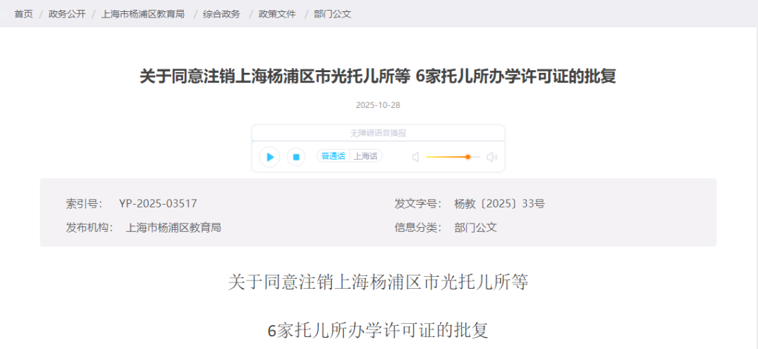 上海宝山区海蓝幼儿园、罗新幼儿园、泗塘幼稚园: 你们三所民办学校递交的《关于上海宝山区海蓝幼儿园终止办学的申请》《关于上海宝山区罗新幼儿园终止办学的申请》《关于上海宝山区泗塘幼稚园终止办学的申请》及相关材料已收悉,依据《中华人民共和国民办教育促进法》《中华人民共和国民办教育促进法实施条例》等有关规定,经审查研究,同意你们三所民办学校终止办学。 办学许可证:上海宝山区海蓝幼儿园(许可证编号:教民 331011360000448号)、上海宝山区罗新幼儿园(许可证编号:教民 331011360000678号)、上海宝山区泗塘幼稚园(许可证编号:教民 331011360000058号)予以注销。 新学期已过半,2025年余额也仅剩不到2个月,小编翻阅教育局官网发现,近日又有30所学校官宣终止办学; 另外今年以来,上海已经有78所学校关停;有关停就有新建,今年上海共51所新建校。 具体是哪些学校呢?我们一起来看…… 1.小童星幼儿园 关于同意注销“上海奉贤区小童星幼儿园” 办学许可的批复 上海奉贤区小童星幼儿园: 你公司提出的关于注销“上海奉贤区小童星幼儿园”的申请及相关材料已收悉,根据《中华人民共和国民办教育促进法》《中华人民共和国行政许可法》的有关规定,经审核,同意注销“上海奉贤区小童星幼儿园”办学许可登记,依法办理终止手续。 特此批复。 上海市奉贤区教育局 2025年10月27日 2.织梦幼儿园 关于同意注销“上海奉贤区织梦幼儿园” 办学许可的批复 上海奉贤区织梦幼儿园: 你公司提出的关于注销“上海奉贤区织梦幼儿园”的申请及相关材料已收悉,根据《中华人民共和国民办教育促进法》《中华人民共和国行政许可法》的有关规定,经审核,同意注销“上海奉贤区织梦幼儿园”办学许可登记,依法办理终止手续。 特此批复。 上海市奉贤区教育局 2025年9月28日 1.星之梦幼儿园 上海市宝山区教育局关于同意终止上海宝山区星之梦幼儿园办学许可的决定 上海宝山区星之梦幼儿园: 你园递交的《关于上海宝山区星之梦幼儿园终止办学的申请》及相关材料已收悉。依据《中华人民共和国民办教育促进法》等有关规定,经审核研究,同意你园终止办学。办学许可证(编号:教民331011360000638号)予以注销。请你园依法向登记管理部门办理注销登记手续。 上海市宝山区教育局 2025年8月21日 2.民办天安幼儿园等9所民办学校 上海市宝山区教育局关于注销上海宝山区民办天安幼儿园等9所民办学校办学许可的通知 1.众兴小学 上海市松江区教育局关于同意上海松江区众兴小学终止办学的批复 上海松江区众兴小学: 你学校提出的关于终止办学的申请报告已收悉。经研究,同意你们终止办学的申请。 请你们根据《中华人民共和国民办教育促进法》有关规定,依法办理相关的注销登记手续。 市光托儿所等6家托儿所 关于同意注销上海杨浦区市光托儿所等6家托儿所办学许可证的批复 上海杨浦区市光托儿所、上海杨浦区双辽托儿所、上海杨浦区隆昌托儿所、上海杨浦区中原托儿所、上海杨浦区国定托儿所和上海杨浦区平凉托儿所,你们申请注销办学许可证的相关材料已收悉,根据《中华人民共和国民办教育促进法》的第五十六条第一款规定,同意你园注销办学许可的申请,请自收到本文15日内持本批文到上海市杨浦区民政局办理相关注销登记,完成相关手续1个月内通过书面形式向我局报告。 此复 杨浦区教育局 2025年10月10日 1.余姚托儿所 上海市静安区教育局关于同意上海静安区余姚托儿所终止办学的批复 上海申静商业服务有限公司、上海静安区余姚托儿所: 你单位递交的关于上海静安区余姚托儿所终止办学的申请材料已收悉。根据《中华人民共和国民办教育促进法》第八章的有关规定,经审查,同意上海静安区余姚托儿所终止办学,同时注销办学许可证(办学许可证号:教民131010660530088号)。 接此批复后,你校应尽快妥善完成剩余资产处置,并向相关部门办理注销登记手续。 特此批复。 上海市静安区教育局 2025年8月21日 2.张家宅托儿所 上海市静安区教育局关于同意上海静安区张家宅托儿所终止办学的批复 上海申静商业服务有限公司、上海静安区张家宅托儿所: 你单位递交的关于上海静安区张家宅托儿所终止办学的申请材料已收悉。根据《中华人民共和国民办教育促进法》第八章的有关规定,经审查,同意上海静安区张家宅托儿所终止办学,同时注销办学许可证(办学许可证号:教民131010660530038号)。 接此批复后,你校应尽快妥善完成剩余资产处置,并向相关部门办理注销登记手续。 特此批复。 上海市静安区教育局 2025年7月31日 3.民办双美幼儿园 上海市静安区教育局关于同意上海静安区民办双美幼儿园终止办学的批复 上海双美软件开发有限公司、上海静安区民办双美幼儿园: 你单位递交的关于上海静安区民办双美幼儿园终止办学的申请材料已收悉。根据《中华人民共和国民办教育促进法》第八章的有关规定,经审查,同意上海静安区民办双美幼儿园终止办学,同时注销办学许可证(办学许可证号:教民131010860000258号)。 接此批复后,你校应尽快妥善完成剩余资产处置,并向相关部门办理注销登记手续。 特此批复。 上海市静安区教育局 2025年7月4日 1.民办佳禾幼儿园 关于准予上海浦东新区民办佳禾幼儿园终止办学的批复 上海浦东新区民办佳禾幼儿