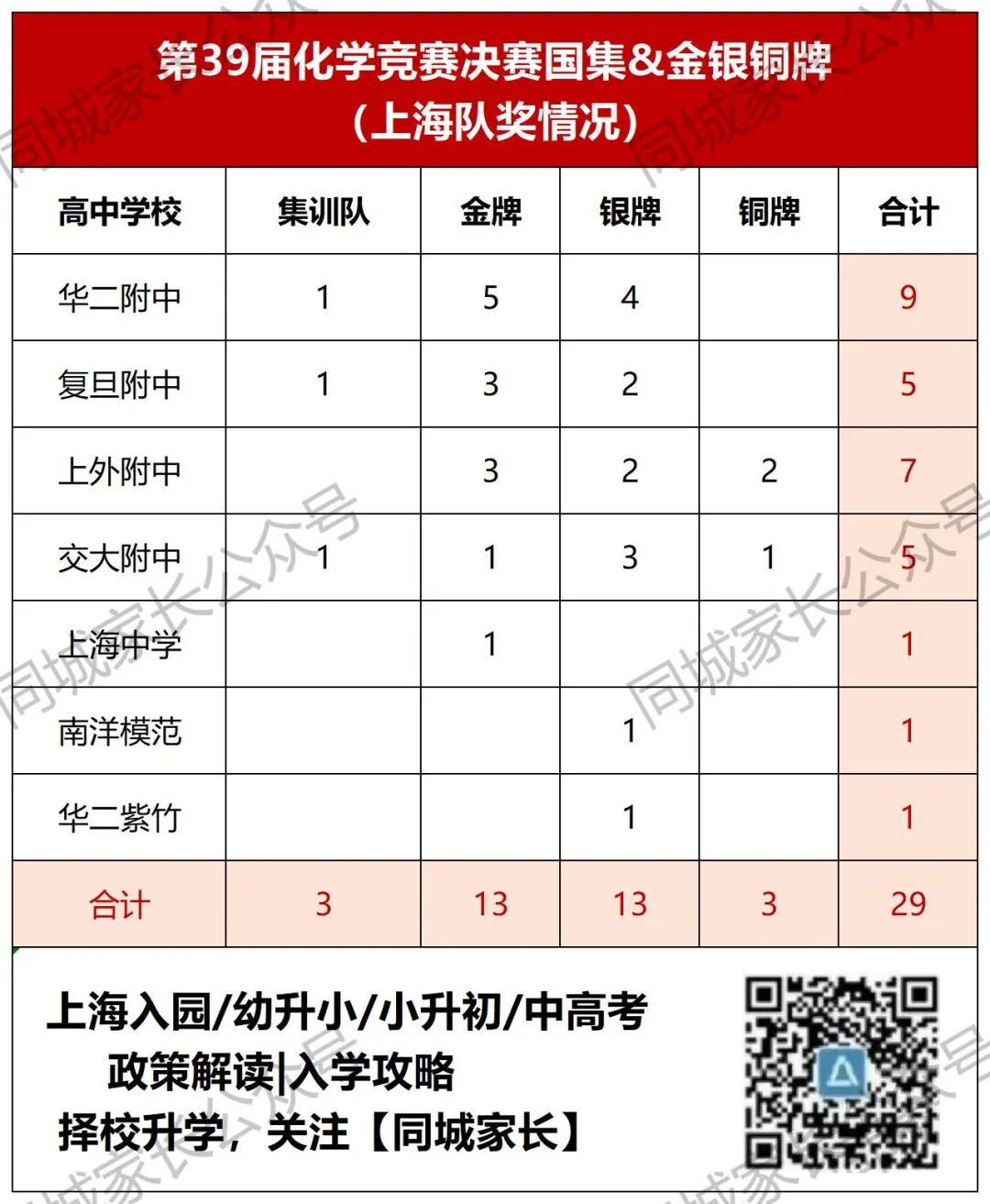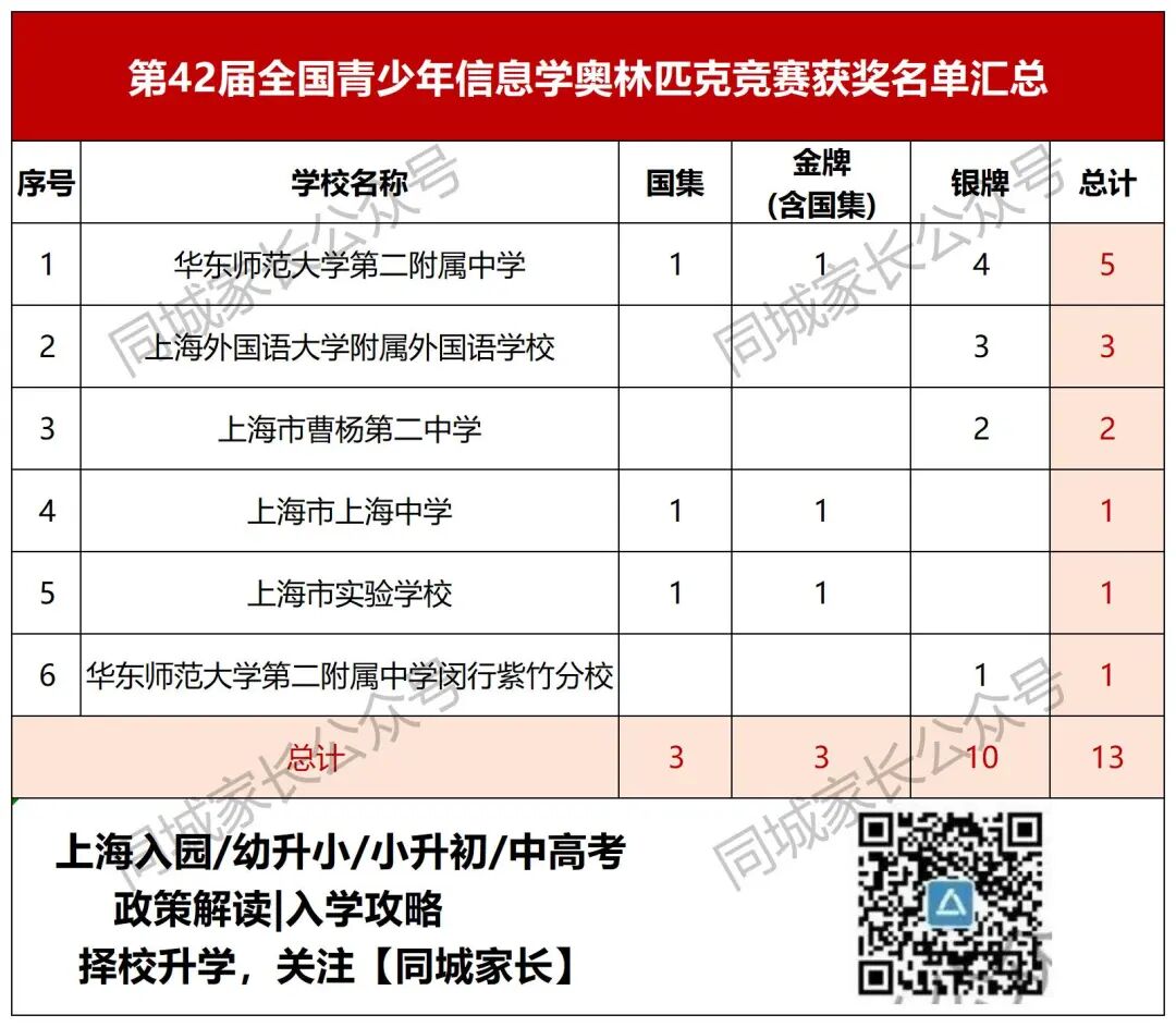 金牌(含国集)13人:华二5人,复附3人,上外附中3人,上中1人,交大附中1人