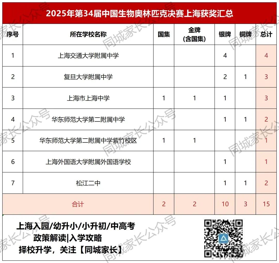 2025年第34届全国中学生生物学奥林匹克竞赛决赛获奖名单正式公布,上海共15名同学获奖。