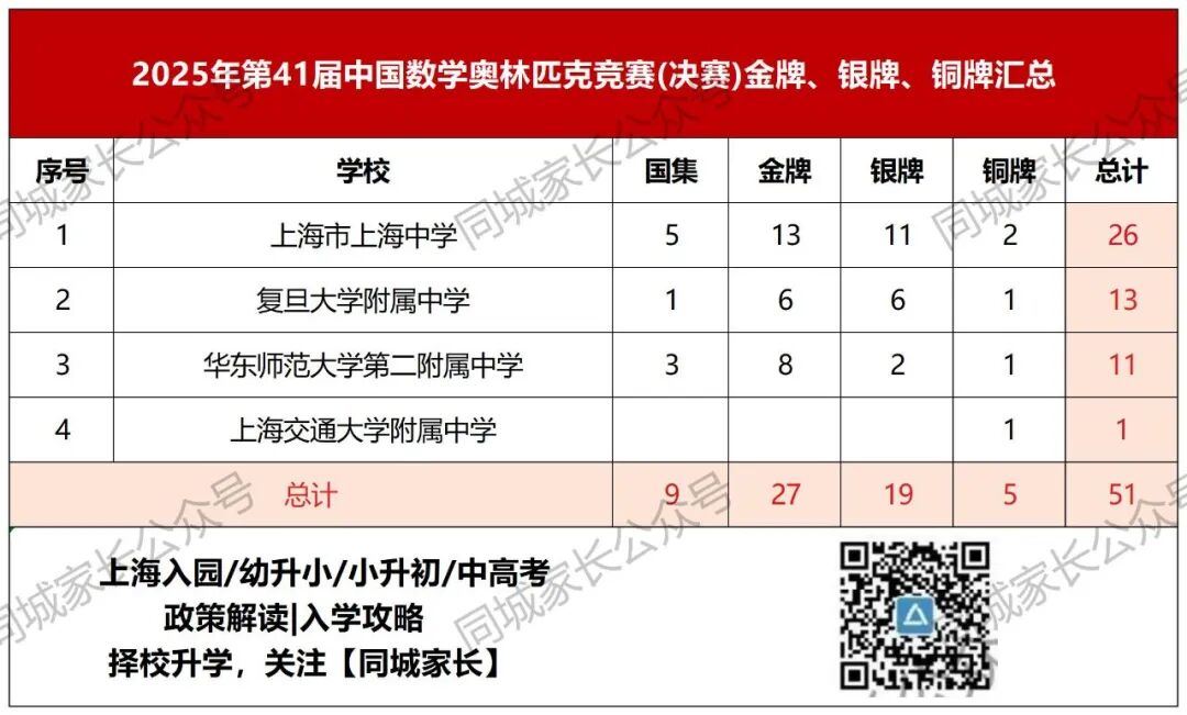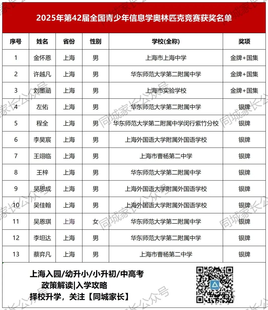 银牌13人:华二4人,交大附中3人,复附2人,上外附中2人,华二紫竹1人,南洋模范1人