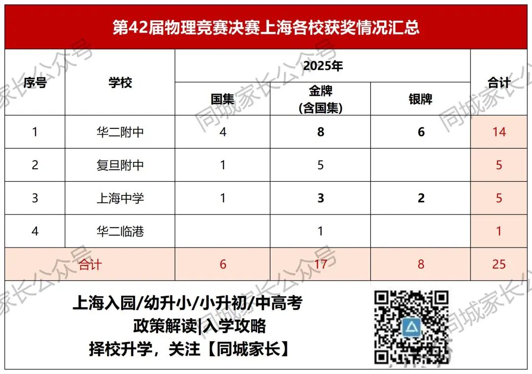 金牌(含国集)17人:华二8人,复附5人,上中3人,华二临港1人