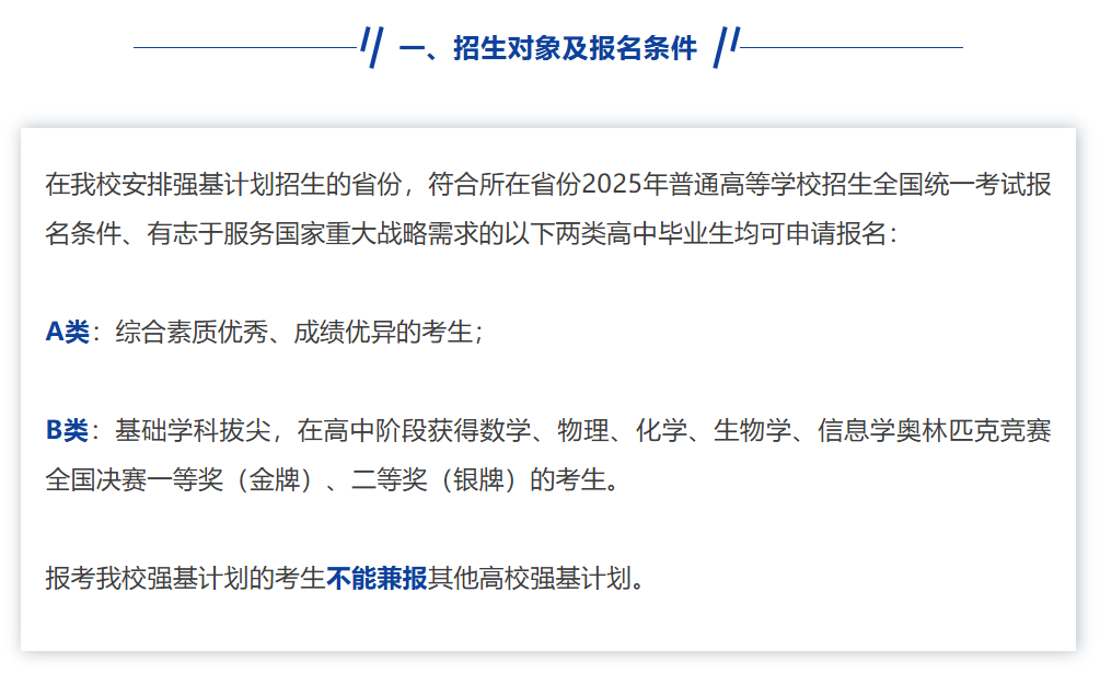 在招生对象上,综合评价与强基计划类似,都是想要招收综合成绩优秀,以及在高中阶段获得竞赛奖项的同学。但无论是在综合成绩上,还是竞赛奖项上,综合评价的要求并没有强基计划那么严格。 综上:奥赛对于高考保送、强基计划招生来说是非常重要的,五大学科奥赛在各高校选拔中的认可度排位:数学≥物理>化学>信息、生物
