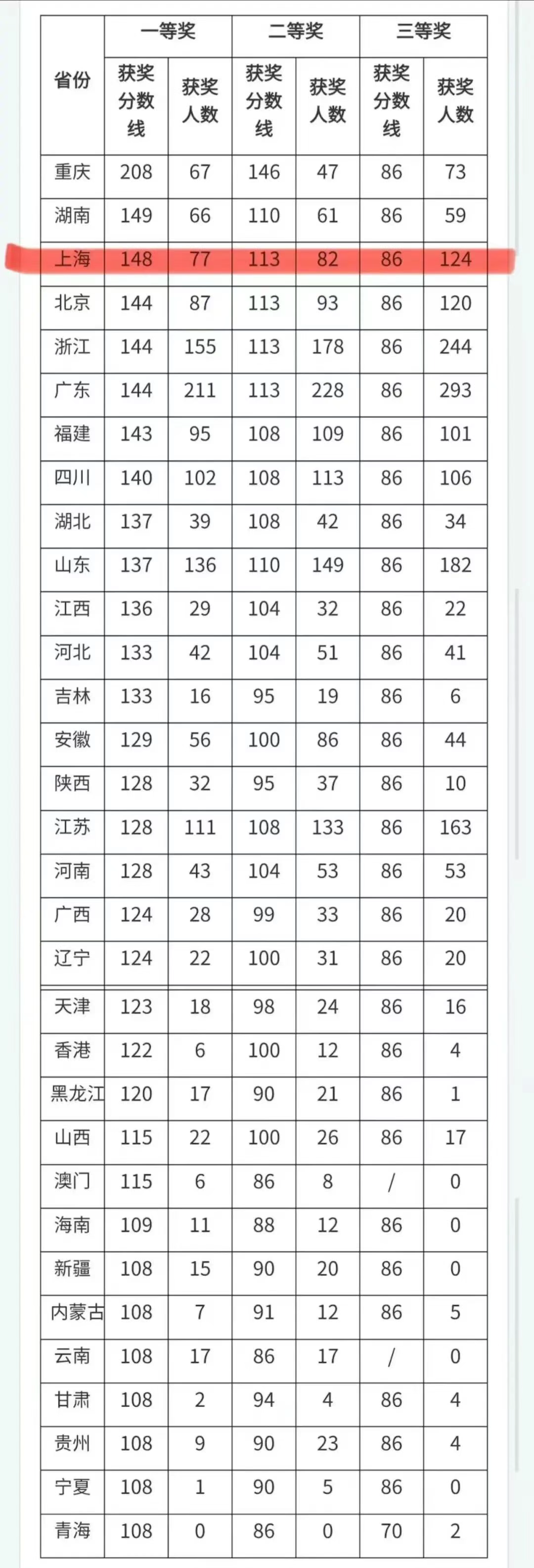 此次,上海的分数线排全国前三,分别是:一等线:148分;二等线:113分;三等线:86分