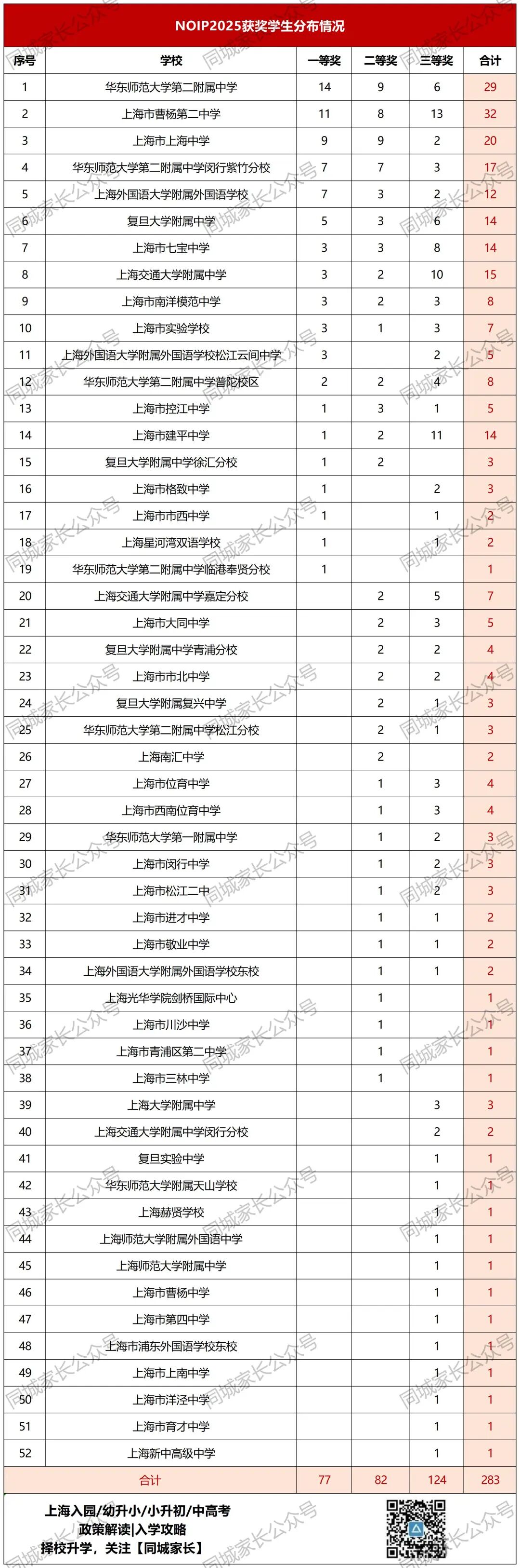 本次信息学竞赛,上海共283人获奖,分别是:一等奖77人,二等奖82人,三等奖124人,他们来自上海52所高中。