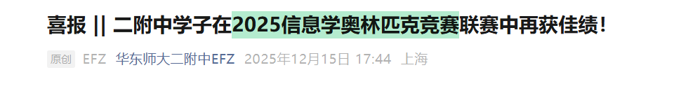 近日,华二官微也发布了喜报: 二附中学子在2025信息学奥林匹克竞赛联赛中再获佳绩!