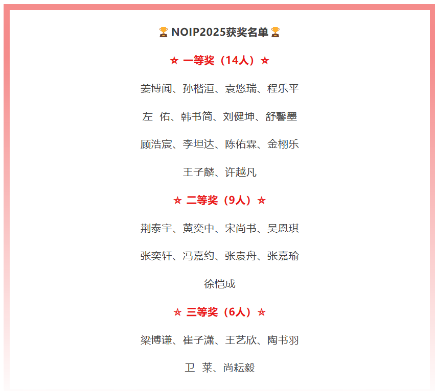 日前,中国计算机学会就公布了2025获奖名单。全国青少年信息奥林匹克竞赛(NOIP)是高中五大联赛之一。