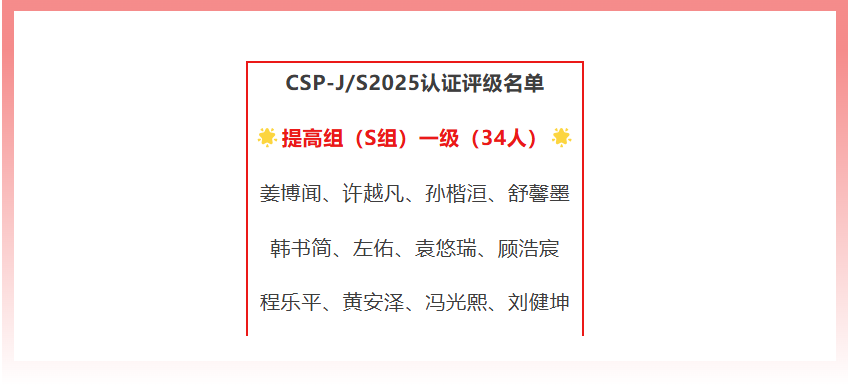 在11月1日举办的CSP-J/S2025第二轮认证中,我校学生取得各级认证共计提高组一级34人、提高组二级17人、J组一级14人。