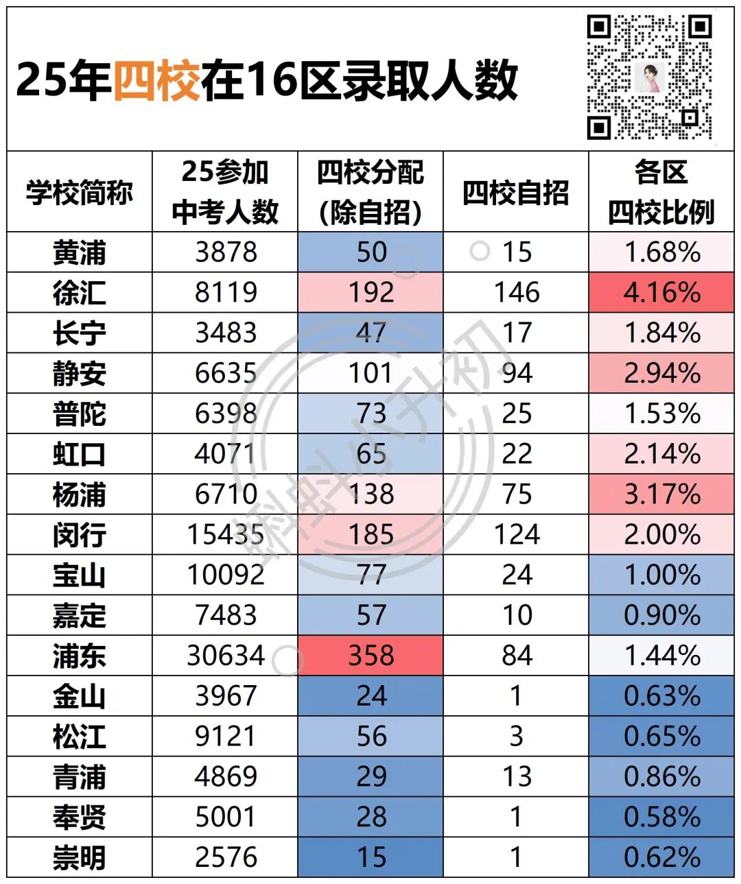 徐汇、杨浦直接断层领跑。 徐汇常规批次的四校录取率是2.45%,加上自招后,直接飙到了近4.2%;杨浦去掉自招后,四校率也能稳在2%-3%,仍旧是16区最高。 但奉贤四校率仅0.53%,青浦、金山、崇明齐刷刷卡在0.59%,差不多是徐汇的1/8。 名额到区是四校招生的主力军,2025年名额到区共1140个名额,较去年增加97人,占总招生计划的52.1%。 1140 个名额里,徐汇占比超12%,杨浦紧随其后,光是这两个区就分走了近23%的名额到区计划。 就算是浦东这样的人口大区,虽然拿到了约25%的名额,但架不住中考人数突破3万,分摊到每个考生头上的机会,其实远不如徐汇、杨浦。 除了徐汇和杨浦,静安由于众所周知的原因,一直是考四校相对低分的区,而虹口也一直是近年全市中考红利最大的区,而大家都想去的黄浦其实没啥红利。 郊区分到的名额,只能用稀缺来形容:崇明仅7个、金山16个、奉贤19个,三个区加起来还不到徐汇的1/3。 总的来说,上海四校招生并非盲目偏爱,而是基于生源质量、教育资源分布的选择。 市区的整体升学氛围更好,四校投放更多名额,可以高效筛选出适配的生源。 郊区的资源相对分散,升学竞争力偏弱,四校的名额投放自然 “吝啬”。 之前和一位嘉定的家长聊过,孩子对口的初中属于区内中等水平,近几年中考能考上四校八大的学生寥寥无几。 为了给孩子铺路,他们动了买房换区的心思,目标很明确:选一个户籍对口政策友好、优质初中集中的区,走 “人户一致” 顺位,挤进一所靠谱的初中。 看了户籍对口的几个区,实在是卷不动,想去普陀、黄浦又由于时间问题来不及办理学籍,于是放弃。把宝压在了摇号,好在最后摇去了一个不错的学校。