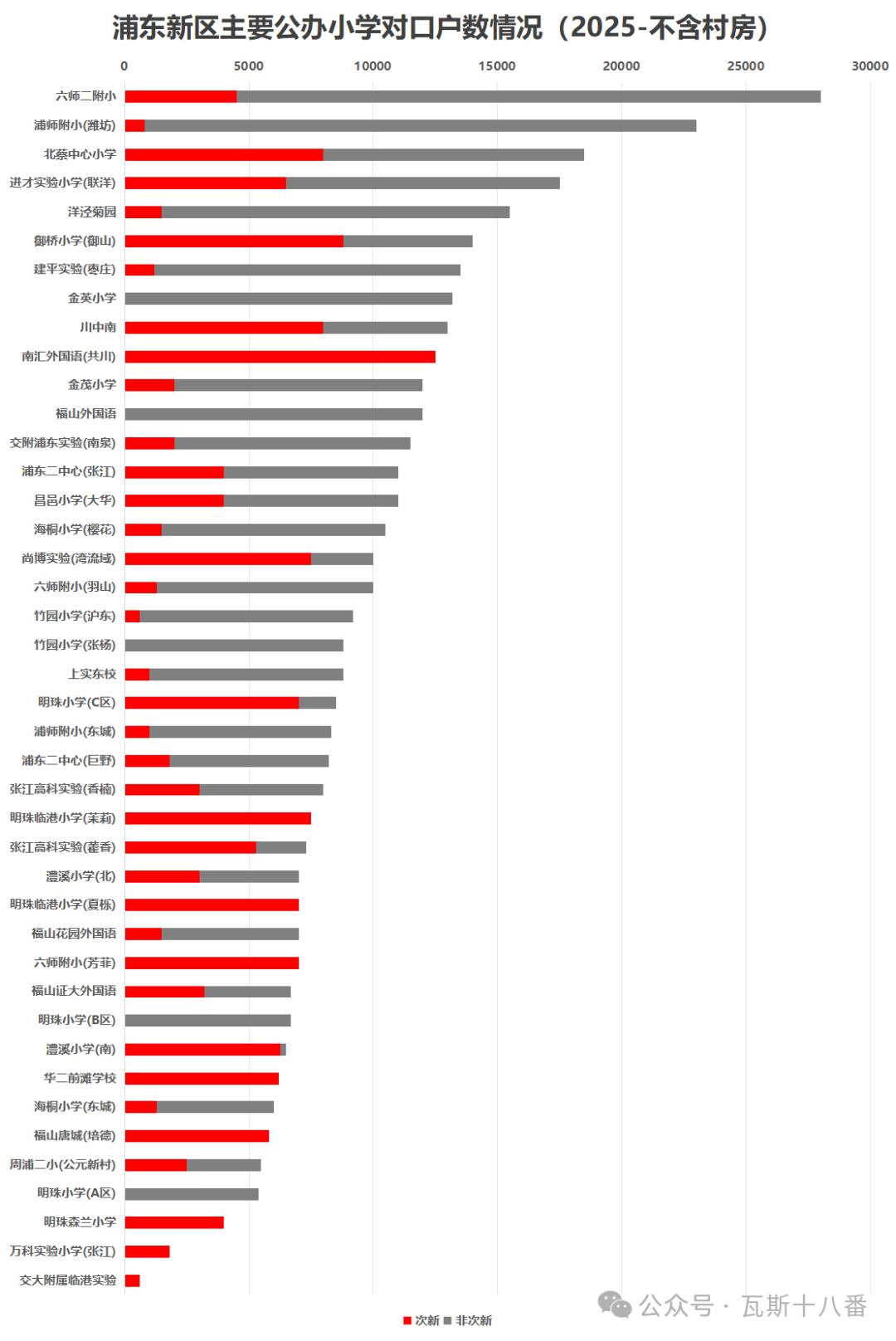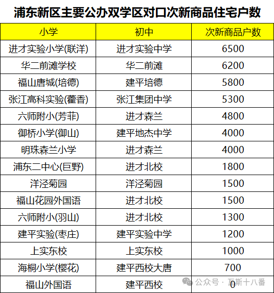 除去较难统计的村房外,整个浦东对口户数最多的小学是核心区内的六师二附小和南汇地区的惠南小学,均接近3万户。