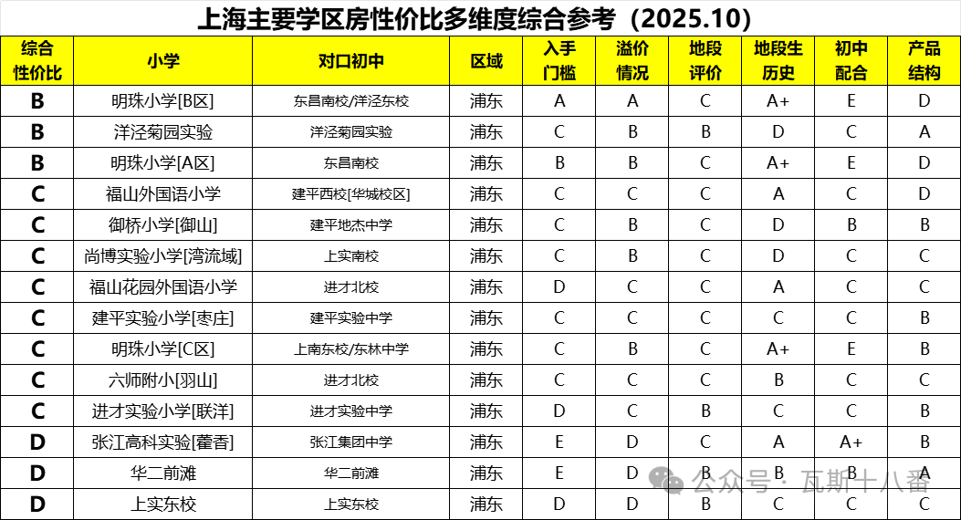 我往前翻了翻之前统计过的全市小学的溢价和性价比情况,发现浦东其实是一个低性价比的区域。