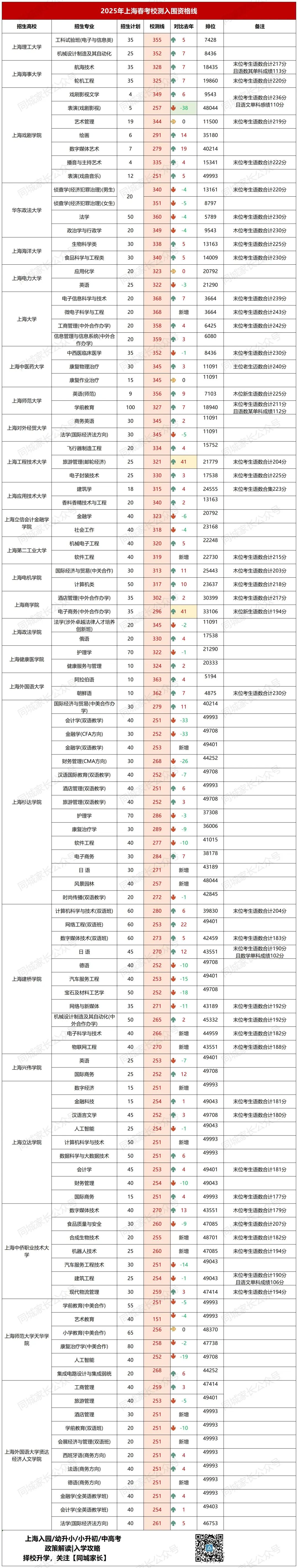 2025年上海春考校测多校录取难度增加!最高368分!42个专业分数上涨,最高上涨41分:
