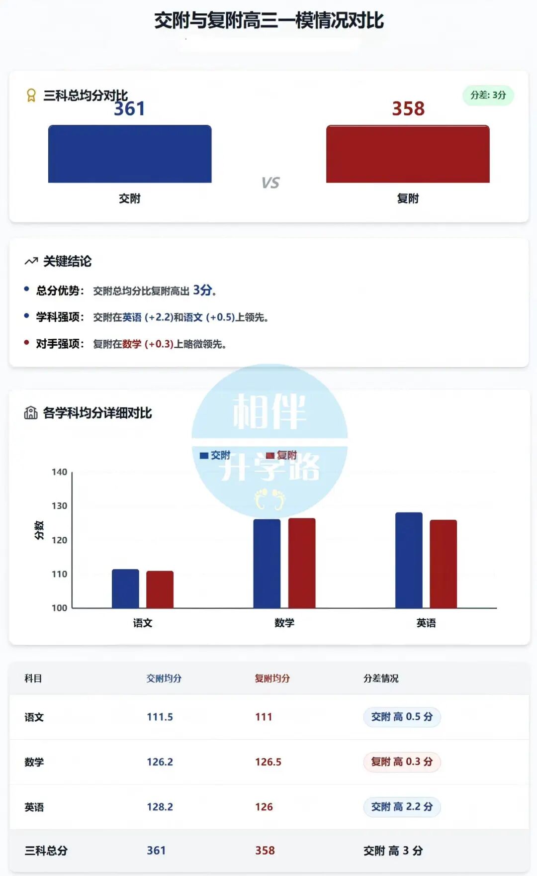 然而这次一模,交附不仅在三总均分高出复附3分,而且语文和英语也分别比复附高出0.5和2.2分。