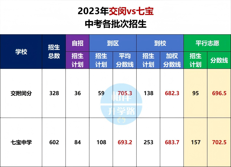 我们先看“入口”:2023年中考,七宝中学平行志愿分数线702.5分,交附闵分仅为696.5分。当年的生源,七宝是碾压交附闵分的,整整高出6分!