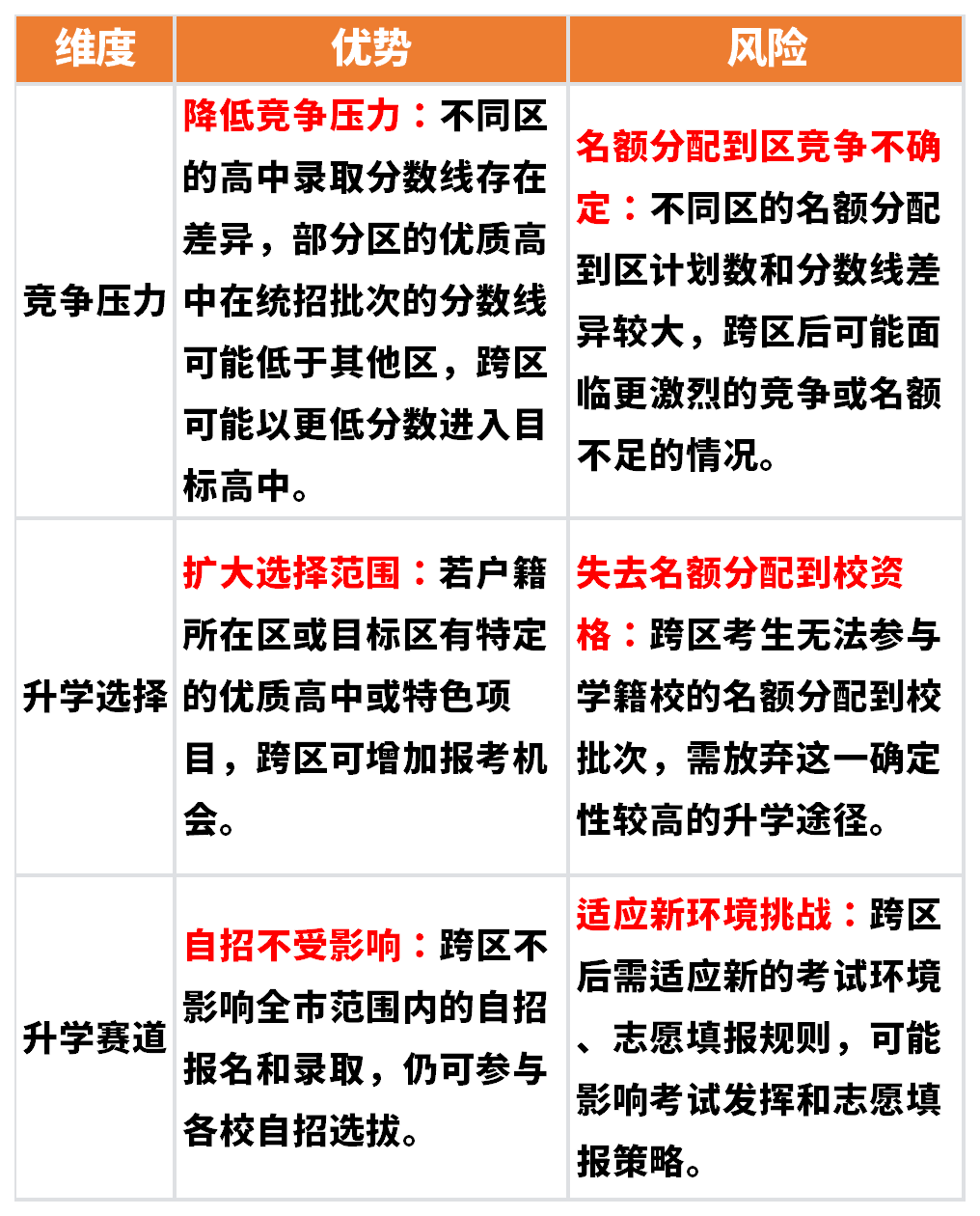 当然,跨区考也不是仅有优势,风险也是相伴而生,核心在于能否根据自身情况做出取舍,这里也给大家整理出了核心优劣势对比,有择校需求的家长可以参考看看:
