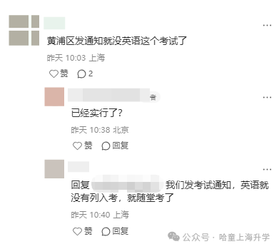 具体到宝山各校的执行情况,也略有不同。有的学校早早就已经考完英语了,所以并不受这个通知影响。 有的学校就抓紧时间,抢在22号之前考完,比如本来要在22号考英语的,就调到21号去考。 有的学校就真的取消了,完全没考英语,家长还说,自己孩子有英语免试资格,这下大家都不用考英语了,孩子优越感瞬间没了