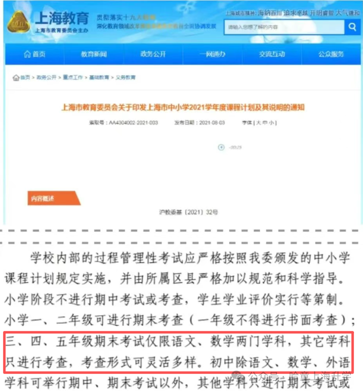 明确上海小学阶段三至五年级期末考试仅限语文、数学两科,其它学科只进行考查,考查形式可以灵活多样。
