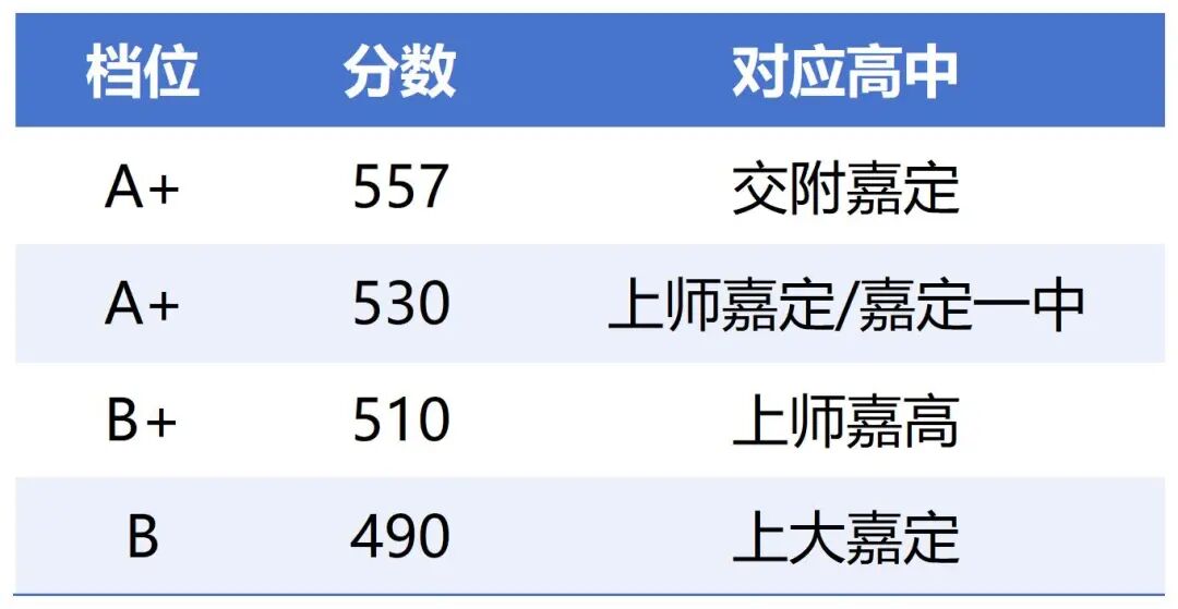 杨浦一模参加人数约7200人,满分645,分值构成:语文150+数学150+英语150(含听说)+综合135+道法30+历史30=总分645分 1、这次杨浦一模整体难度和往年相当,阅卷也较严。目前了解到的语文平均分只有90.5,全区最高分128,语文平均分为90分,最高128分,值得注意的是,本次课外文言文题型 “暗藏玄机”,直接选用2021年崇明区高三一模文言文二的原篇,初中考生面对高中难度文本,失分率居高不下也在情理之中。 数学均分100分左右,但从考生反馈来看,还是会有不少学生考到120分以上,130分以上也有。物理均分41左右,化学均分32分,均分偏低,今年阅卷已经有适度的放水,所以足见本次理化难度很高。 2、区排位参考消息: 总分被分为A、B、C、D四档,A档门槛线497分,B档门槛线446分,基本分别对应到区重和普高的位置。 3、杨浦一模分数的小道消息,一模均分兰生第一,杨浦双语第二。全区580以上不足10人,某同学总分448.1,排名全区69.4%。 ①同济新江湾:年一597 ②兰生:593年一、560+年20 ③同大实验:580.5年一、 552年6 ④杨实验:569年一、549年3 ⑤三门中学:563年一 ⑥上音实验:597年一、592.5年2 ⑦存志:555年12 ⑧复旦二附校:549年10 徐汇区一模约8700人参加,满分700,分值构成:语文150+数学150+英语140+物理100+化学100+道法30+历史30=总分700分 1、徐汇一模语文难度中等偏上,没有出现极端难题,但对考生的文本解读、逻辑表达能力要求较高,适合基础扎实、擅长综合运用的考生发挥。 数学均分99.86,普遍学生125+没问题。但数学难题拉分比较大,核心拉分点集中在压轴题,最后一道题目全区仅个位数孩子满分,是考察尖子生的关键题型。 英语作文最高分19分,没有满分。物理区均分71,难度较大,核心难点主要集中在最后3题。 2、一哥这次一模有很多分数在650+的。 嘉定区一模约8670人参加,满分635,分值构成:语文150+数学150+英语140+物理70+化学50+道法30+历史30+跨学科15=总分635分 1、与徐汇、杨浦不同,嘉定一模整体偏基础,只要基础扎实高分是没问题的。但史政科目意外成为“拦路虎”,历史书上基本翻不到,全靠自己编,道法完全来不及写。 语文、数学、英语三大主科及物理、化学理综科目,整体难度偏低,考生普遍反馈“不难”。这类科目核心考察基础知识点的掌握程度,只要平时功底扎实、答题细心,规避低级错误,就能斩获高分,对中等及以上考生十分友好。 2、嘉定区排划分为5档11第,除了头尾是5%一档,中间区间全部为10%一档。 按照参考人数8670来算,A+大约是433人,接下来每867人一档,最后433人一档。目前已知的一些档位,分别是: 577分,区1%,A+ 559,档位为A+。 556.5,档位为A。 516.5,档位为B+。 上外嘉定年一597分,年二593分。杨浦区