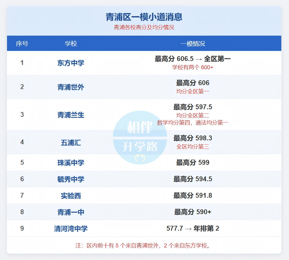 青浦的战局非常有意思,今年不仅是民办的内战,公办学校也有黑马。1、东方中学:最高分606.5,拿下区一!且有两个600+。这在公办学校里是非常炸裂的成绩。2、青浦世外:最高分606,均分全区第一。老大哥地位依然稳固。3、青浦兰生:最高分597.5,均分全区第二。值得一提的是,兰生在25届中考被五浦汇压了一头后,这次一模终于扳回一局,数学均分全区第四,道法全区第一。4、五浦汇:最高分598.3,均分这次不敌青浦兰生,不过也未跌出前三。青浦的格局正在发生微妙变化。青浦世外依旧领跑,但青浦兰生和五浦汇的缠斗进入白热化。让人惊喜的还有东方中学,给公办生源争了一口气。