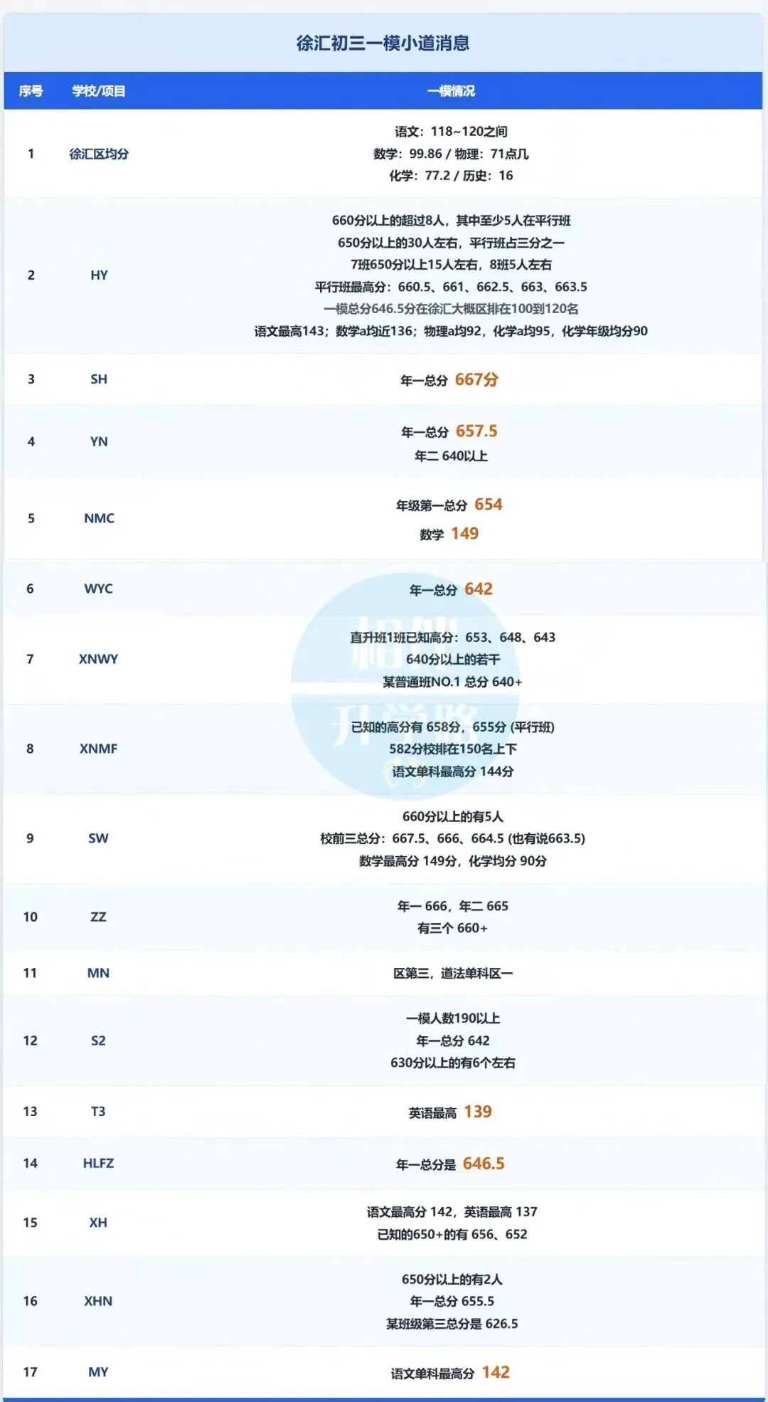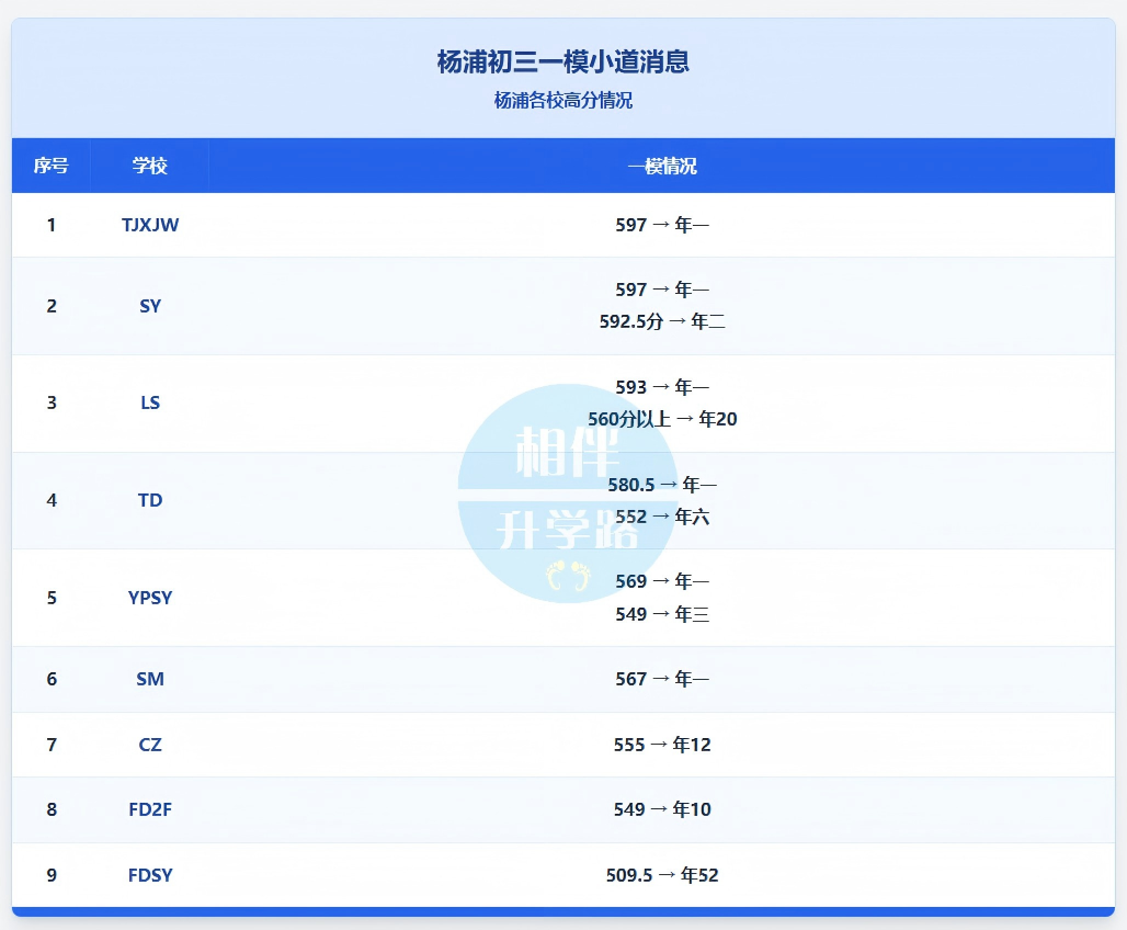 3)上外松外、西外、民乐:最高分均在606-608之间。松江头部咬得很紧,600分以上是名校敲门砖。区均分:语文112,数学100左右,物理44,化学35。培佳双语继25届出了中考状元之后,这次一模又赢麻了,不仅均分排区NO.1,且多学科均分霸榜。高分段: 580分以上仅12人,数学均分104。这次迅行中学均分区第一,数学均分高达123,比区均分高了近20分,总分最高579。在虹口,迅行的实力依然不可小觑。虽然闵行也是只出等第,但还是结合往年的情况给出了相应的定位。徐汇依然是“一超多强”。HY在高分段的厚度让人绝望,但世外、上汇的尖子生在单点爆破上完全不虚。徐汇家长最痛苦的不是考得差,而是“考得好,但排名不一定好”。盯着校排名的同时,一定要换算成区排名,那才是你中考的真实座次。考得好的,觉得“区一”、“A档”到手,中考稳了。别忘了,一模只是诊断,中考才是审判。每年都有大把一模高分,中考因为心态失衡或细节失误而滑档的案例。考得不理想的,容易崩。看着“C档”或是不及格的理化分数,觉得前途无亮。各位,距离中考还有整整一个学期! 一模最大的价值,就是无情地撕开你的遮羞布,告诉你哪里烂了、哪里空了。调整心态,冷静分析,查漏补缺。家长稳住,孩子才能稳住。2026中考这场仗,现在才刚刚进入下半场!排位不好看?寒假就是最好的“超车道”。不要让一模的成绩单成为你的判决书,而要让它成为你的作战图。