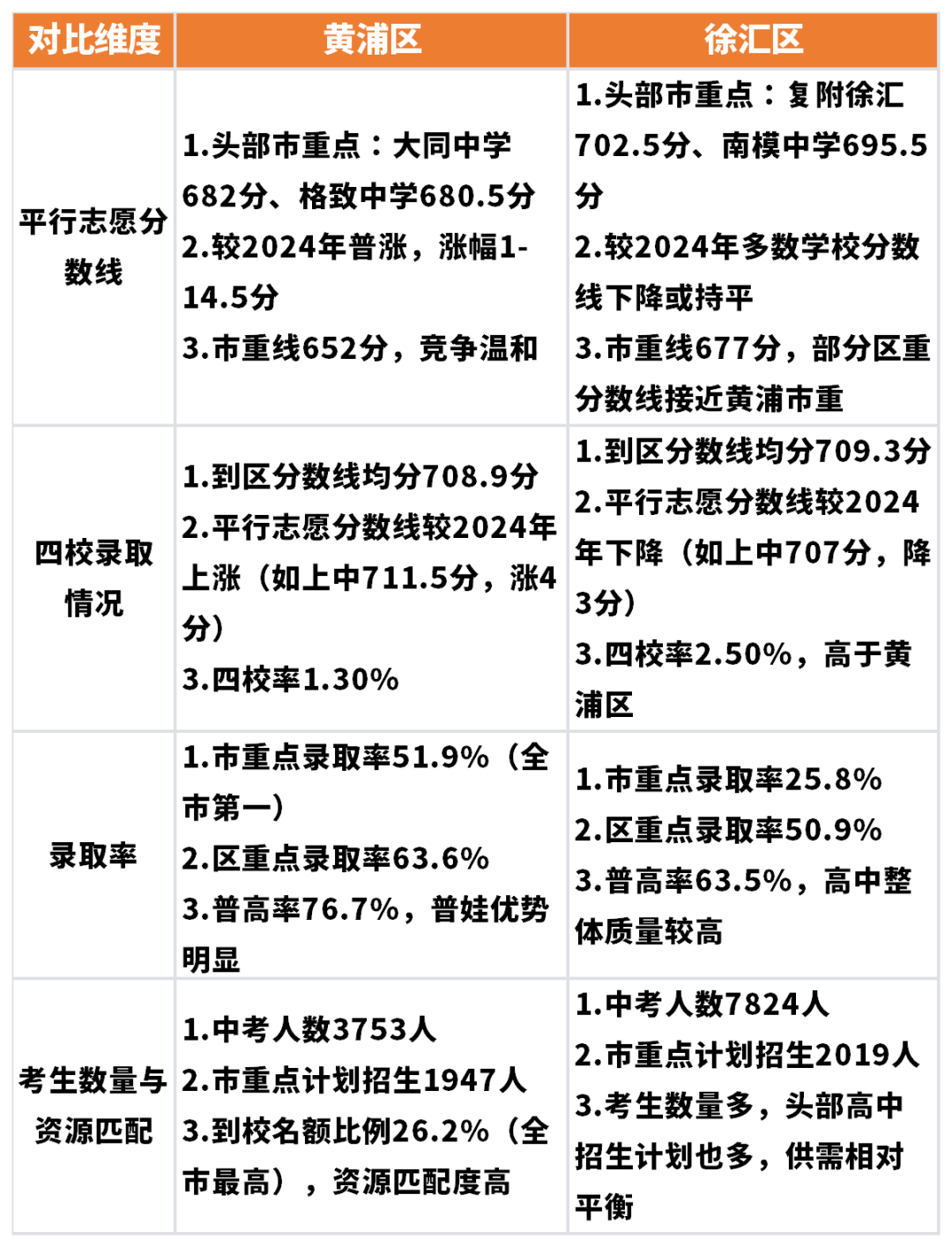徐汇区共有20所高中,数量多于黄浦,包含7所市重点,含四校之首的上海中学、四分校复附徐汇,以及“八大”之一的南洋模范中学、6所区重点和7所普高。 虽市重点总数与黄浦相当,但徐汇的顶尖资源优势无可替代,上海中学作为全市顶尖高中,常年领跑高考升学榜,复附徐汇、南模中学也稳居全市前列。同时,徐汇的区重点、普高层次分布更为均衡。 升学录取率: 黄浦中考人数相对较少,仅约3700人左右,市重点录取率约51.9%,普高录取率高达76.7%,均处于全市领先水平。 对中等水平学生而言,在黄浦参加中考,考入市重点、普高的概率更高,升学路径更稳妥,无需承受过度的竞争压力,适合追求“稳妥上岸”的家庭。 徐汇区市重点录取率约23.58%,普高录取率约62.02%,均低于黄浦区。但徐汇的核心优势不在于整体录取率,而在于四校及四分校的名额分配到区比例较高,顶尖学生有更多机会通过名额分配、自主招生进入优质高中。 尤其是民办初中表现突出,华育中学2025年仍有110名学生通过自招进入四校,其中75人升入上海中学,即便平行班学生也能通过裸考突围,甚至诞生徐汇中考状元。