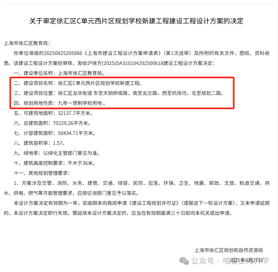 2025年9月,徐汇区政府发布了关于审定徐汇区C单元西片区规划学校新建工程建设工程设计方案的决定。