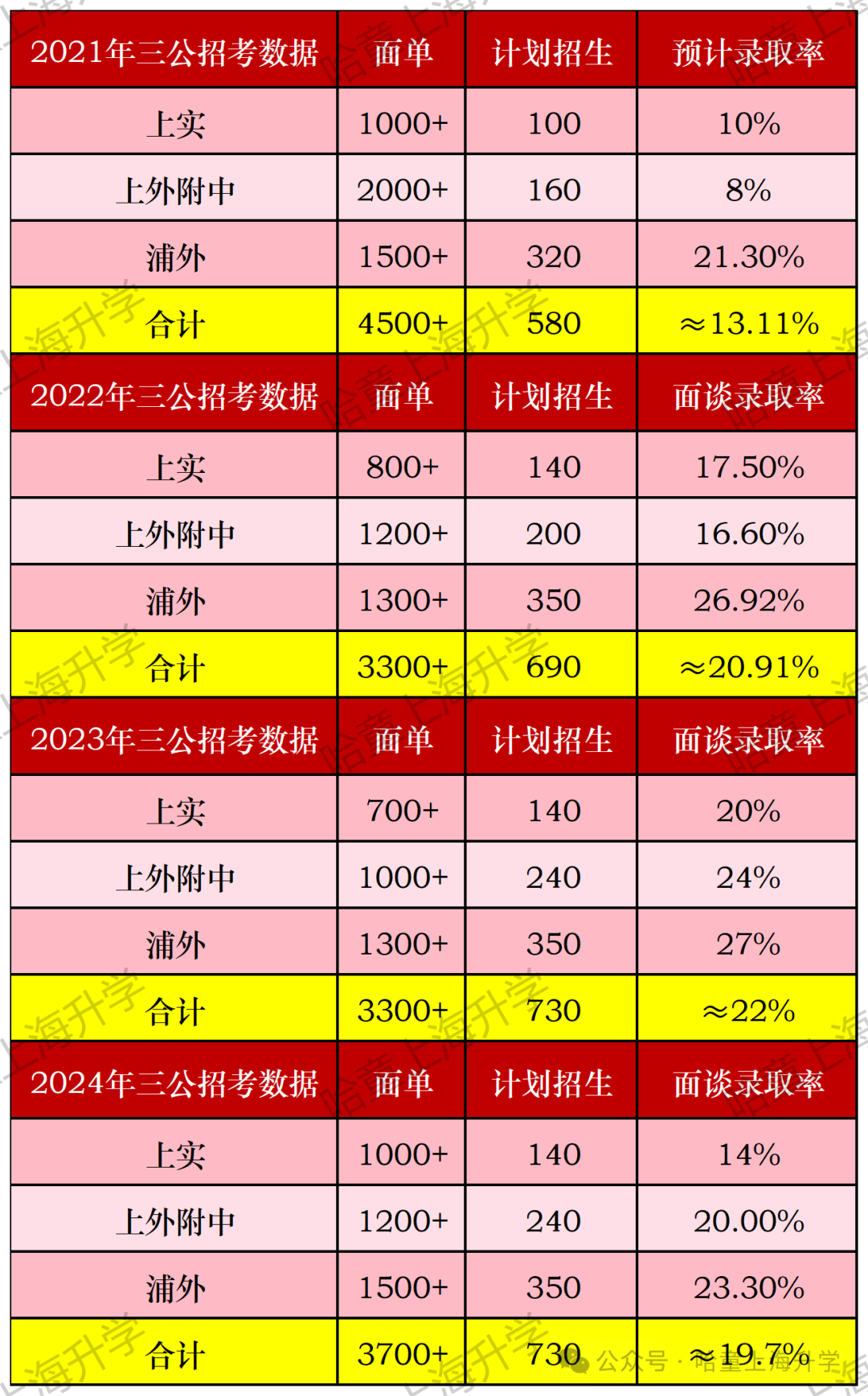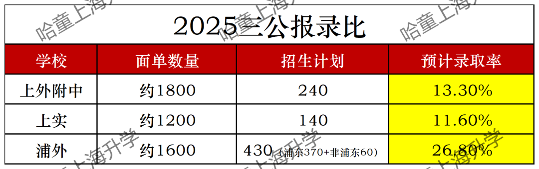 2025年“三公”派发的总面单数约为4600+张,最终录取人数为930人(包含上外附中东校的120人),三校报录比20.21%左右。