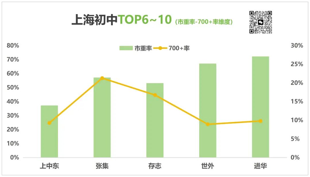 市重率:涵盖自招、名额分配、平行全部批次,综合体现市重点高中录取整体水平。 自招率:仅统计四校、四分自招生源,反映顶尖名校头部生源储备与升学资源优势。 700+率:以校内700分以上学生占比,判断头部学生培优能力。 一所不靠神秘考依然可以培养尖子生的学校。 转制后,对口张江板块家长多为高知人才,重视综合素质,家委会成为家校联动重要纽带,学校与家长双向赋能,共享优质资源。学校与华二联动开设麒麟班,面向校内及托管校选拔,无外部神秘考。 从民办少量地段生到如今全地段生源,张集用4年完成蜕变。即便生源差距大,学校也不放弃、不唯成绩,不少地段生照样考入四校。 事实证明,张集不靠掐尖、不靠神秘考,凭扎实培养也能持续产出尖子生。 徐汇区“双轨并行”,仅次华育的学校。相较于后面的学校也是大幅度领先的,属于“比上不足比下有余”。 在升学上,普通班、双语班均可选择中考或境外路线,九年级时家长再最终确定;融合班一般不转回体制内。 世外的学校活动很丰富,除了社团多种多样,也鼓励学生参加各种比赛。世外和华育的教育理念基本上背道而驰。华育是典型的应试教育,而世外的学习环境是相对松弛的,氛围宽松。 进华最鲜明的标签应该是“数理见长”。 普陀的教育资源比较均衡,一贯制的学校较多,而进华无疑是普陀最好的初中,甚至在全市来说也是十分亮眼。 2018年加入了华师大教育集团,凭借独创的ABC分层教学与 “A+BC” 校本课程,教学成绩稳居普陀区前列。不搞 “一刀切” 的粗放模式,而是根据学生学情精准适配教学节奏。 存志中学也是杨浦民办的代表之一,今年存志四校自招有15人,其中7个学籍挂在十五中。 存志中学一直屈居兰生之下,在杨浦排名第二。但是,存志和同济大学以及控江中学关系密切,在两所名校的加持下,师生比达到1:8.8,高于同区老大兰生。 最近几年,在大部分家长心里存志已经可以和兰生打擂台了。办学成绩相当可以,学校喜欢加强,校内很卷。 上中东是由上中与浦东教育局合作开办的寄宿制公办完中。 虽然作为上中挂名的分校,传承了上中的办学理念和管理模式,但上中东的师资和管理是相对独立的,与上中还是有所区别。 并且从升学数据来看,上中东有很大一部分初三毕业生升入上中东本校的高中部,因此去上中的人数并不如“张宝华”那么多,但其热度绝对不亚于三公。 从市重率-700+率维度来看。 在市重率-700+率这个维度,对五个学校进行了以上的新排名。 #6-张集 #7-存志 #8-进华 #9-世外 #10-上中东 存志、进华和世外这三所学校,在各区都是数一数二的存在。排名有些变化也是各区内的资源分配所致。分数在700+的人数几乎相同,因为考生基数不同才导致700+率相差较大。 上中东校的四校自招人数很低,但是由于高中部的资源倾斜,使得上中东在四校、四分自招总数上位列上述五所学校第一名。 以上6-10名的学校,没有绝对的“好坏”,只有是否适合孩子,后续我们还会继续更新上海初中排名其他名次。