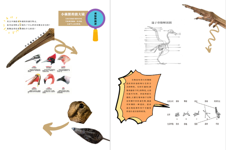 首先,科学老师上线了,跟孩子一起解决“这是什么鸟”的问题。小朋友看到,原来每种鸟的喙、羽毛、脚的形状都那么地与众不同。然后,老师进一步解说鸟的骨骼解剖图,引入了丰富的生物学知识;