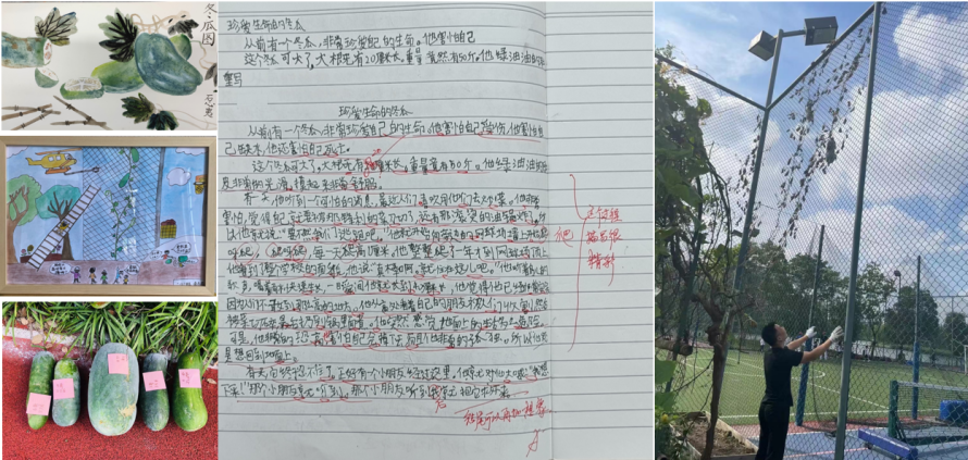 当今的孩子可能很难想象植物“长到天上”去,但筑桥的学生眼见为实——藤蔓带着冬瓜,挂到高高的围栏上。小朋友们很着急,要怎么去把它们摘下来?