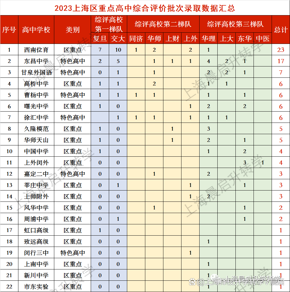 2023高考成绩11校综评录取6人,其中复旦、交大各1人。
